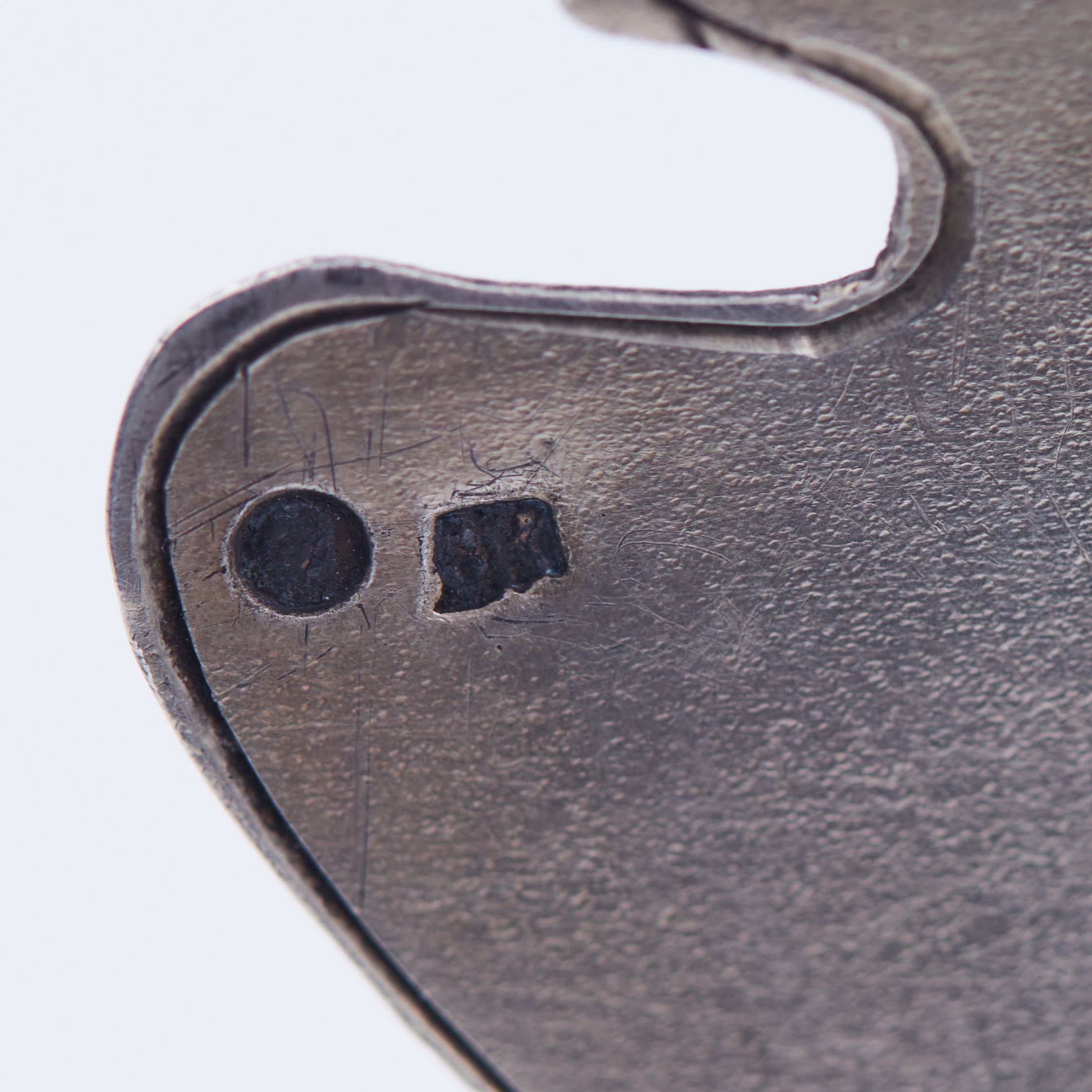 Клейма: Именник мастера «GK» - Густав Клингерт; пробирное клеймо с обозначением пробы «84» в овальном щитке; московское пробирное клеймо с изображением головы в кокошнике, обращённой вправо, введённое реформой пробирных клейм 1899 года.