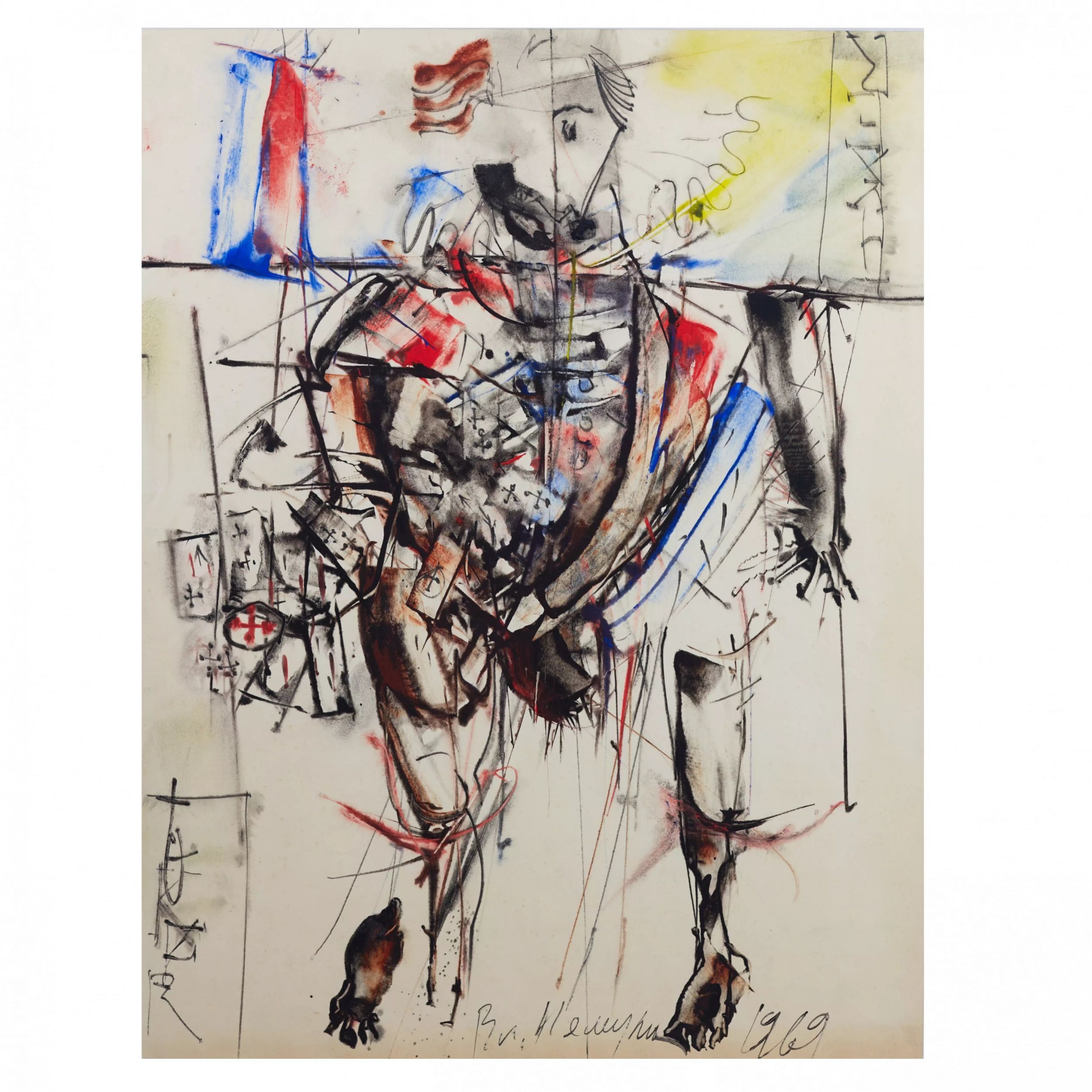 Экспрессивная линия туши соединяется с насыщенными цветовыми акцентами гуаши, создавая ритмически организованную пластическую структуру листа. Карточные символы и условные знаки интегрированы в пространство произведения как элементы устойчивой образной системы, разработанной художником в 1960-е годы. В интерпретации Немухина валет выступает не как персонаж карточной игры, а как метафора судьбы, риска, выбора и исторической неопределённости. Работа отличается редким сочетанием жестовой свободы, интеллектуальной глубины и строгой композиционной дисциплины, столь характерных для лучших листов мастера этого периода. Произведение оформлено в стальную раму с паспарту, под музейным стеклом.