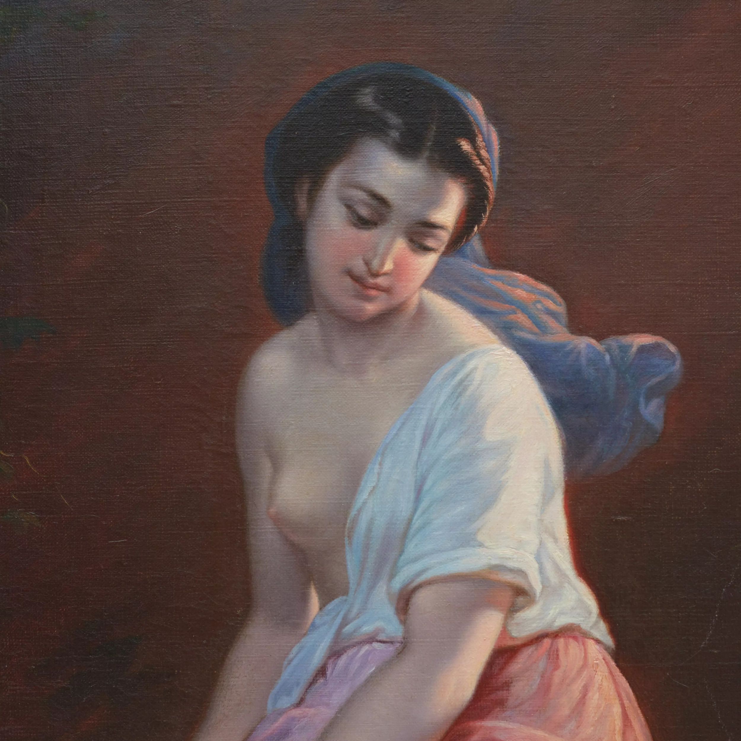 KRIEVU UN EIROPAS MĀKSLAS IZSOLE Nr. 15 · II DAĻADarbs ir izsmalcināts un augstas kvalitātes XIX gadsimta otrās puses akadēmiskās glezniecības piemērs, koncentrēts uz idealizētu sievietes tēlu un saloniskas apceres poētiku. Jaunā sieviete attēlota intīmā piekrastes ainavā krēslas stundā. Kompozīcija balstīta uz mierīgu ķermeņa diagonāli un vieglu galvas noliekumu, kas rada iekšēja klusuma un koncentrēšanās noskaņu. Mēness gaisma kalpo kā galvenais kompozicionālais elements, maigi izgaismojot plecu, kakla līniju un sejas profilu, pakāpeniski izšķīstot fona pustonos un ūdens atspulgā.