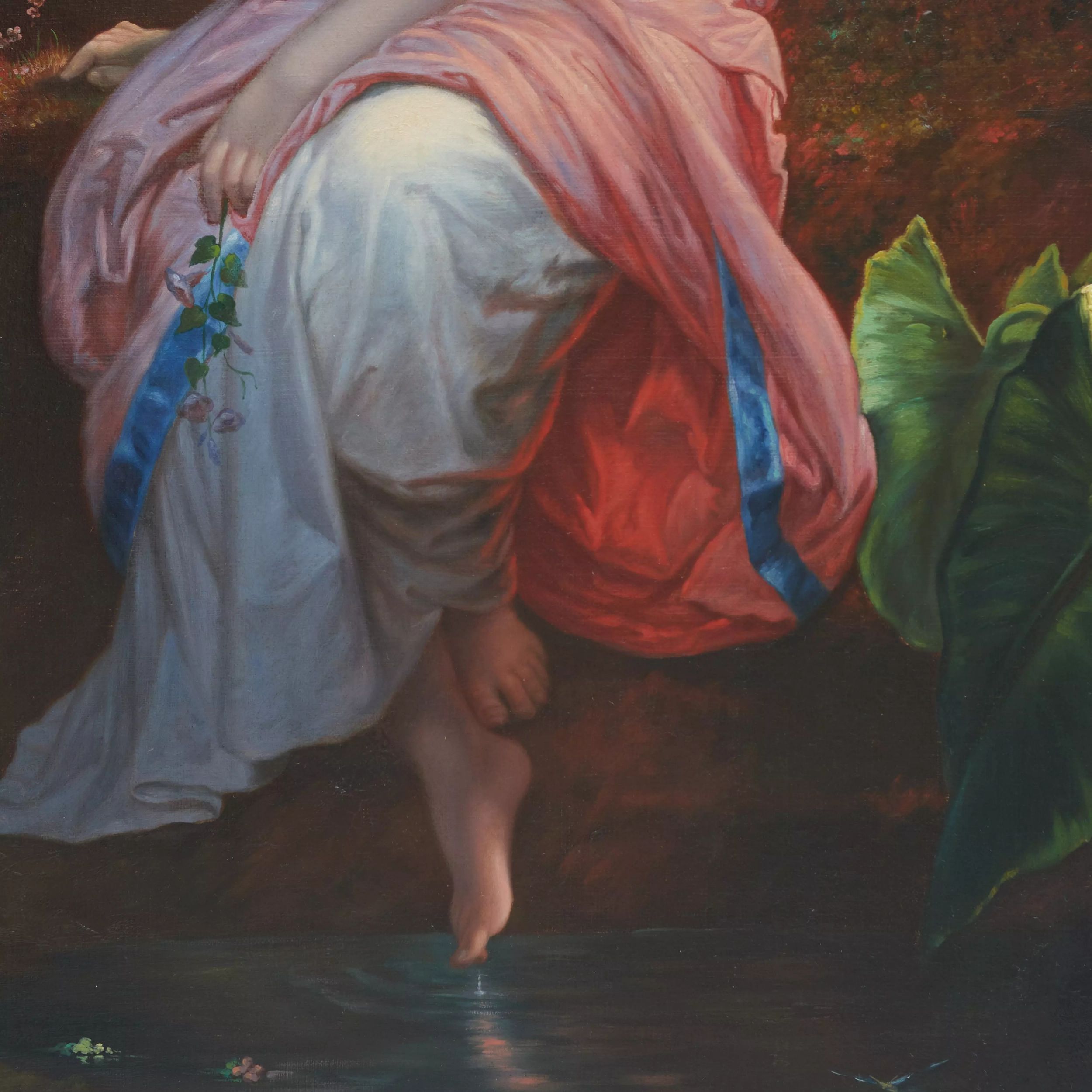 Живописная манера опирается на академическую дисциплину рисунка и тонкую лессировочную моделировку. Пластика тела передана с вниманием к анатомической точности и к идеализирующей гладкости формы. Драпировки трактованы как важный декоративный акцент: тёплые красно-розовые ткани создают цветовой центр полотна и вступают в выразительный контраст с приглушённой коричнево-зелёной средой пейзажа. Баланс светотени и мягкие переходы тонов усиливают ощущение ночной влажной атмосферы и подчёркивают салонную утончённость образа.