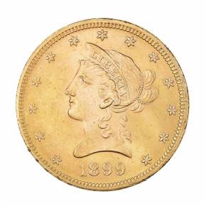1899. gada 10 Liberty dolāru monēta ---- 1899 10 Liberty dolāra monēta A: Liberty galva pa kreisi A: priekšējais ērglis Materiāls: zelts 9001000 Svars: 50,15 grami