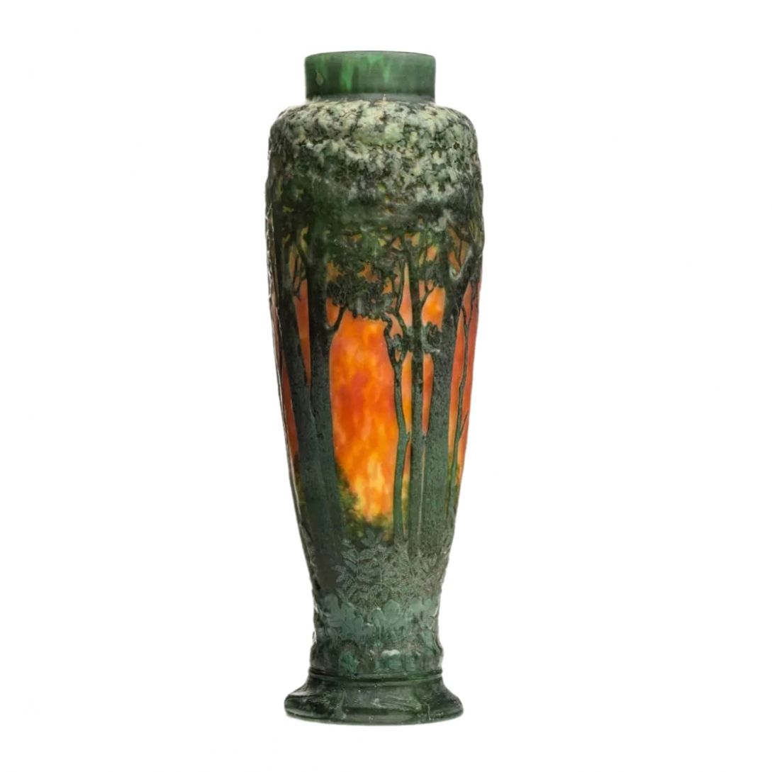 DAUM - Nensija. 1905 Slāņaina koniska pūsta stikla vāze ar taisnu kaklu. Krāšņs dekors ar kokiem, kas savīti augstā reljefā uz saulrieta fona ar dzelteniem un sarkanoranžiem ziediem. Zem pamatnes iegravēts paraksts Daum Nancy. Augstums: 44 cm.
