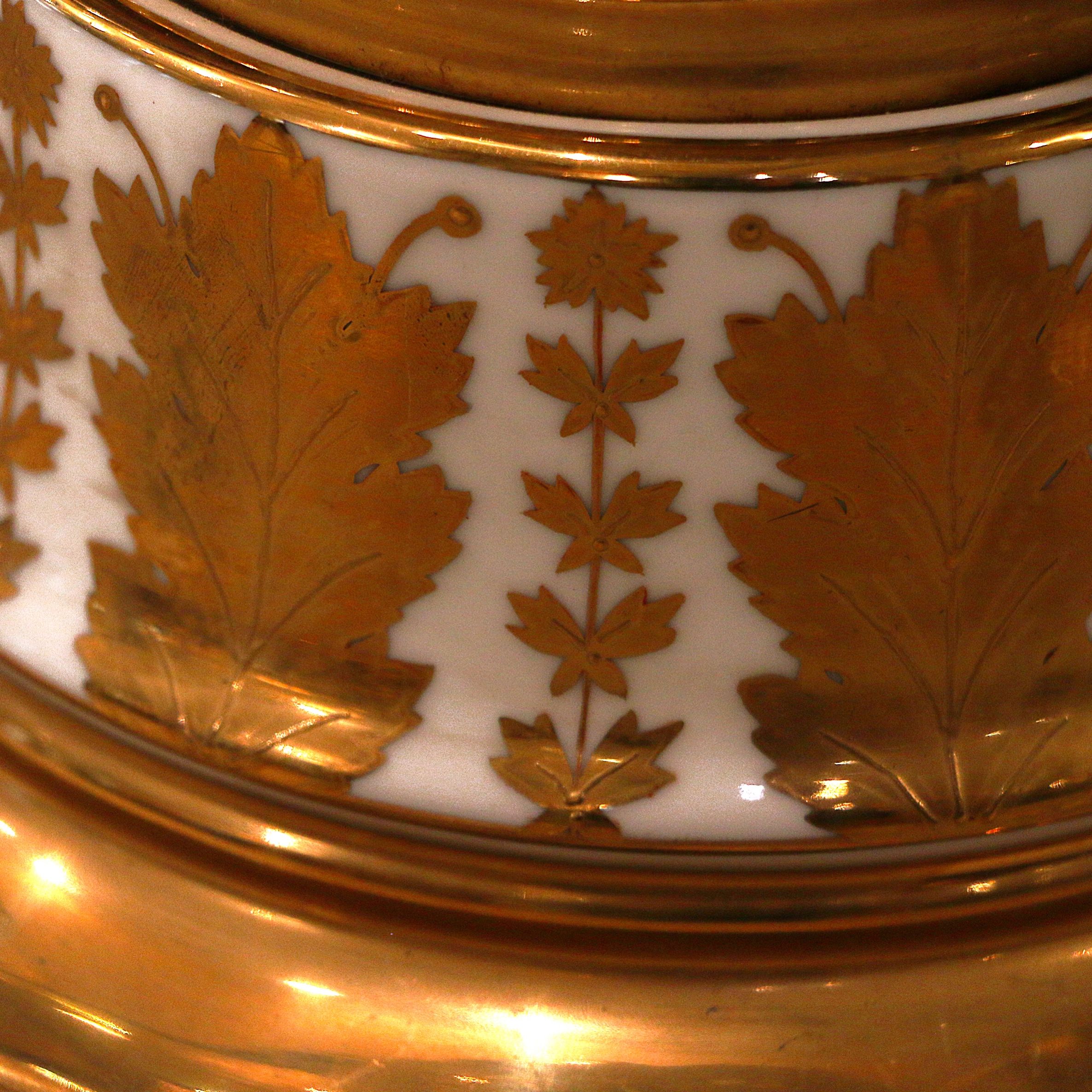 Пара ваз на пьедесталах, украшенных даровыми сценами,скульптурными изображениями крылатых львов и золоченным орнаментом. Клеймо производителя.
