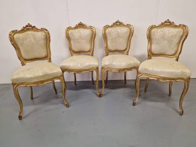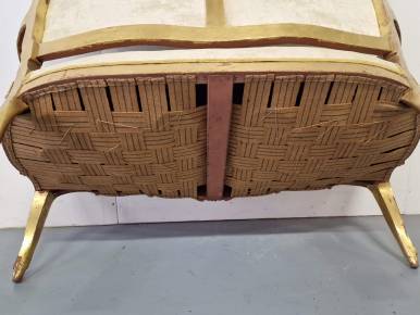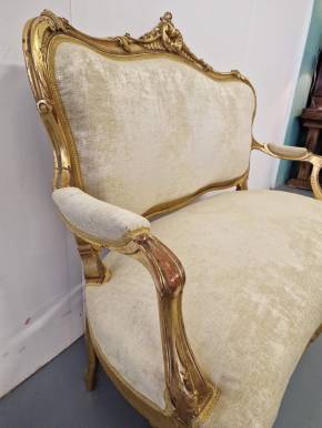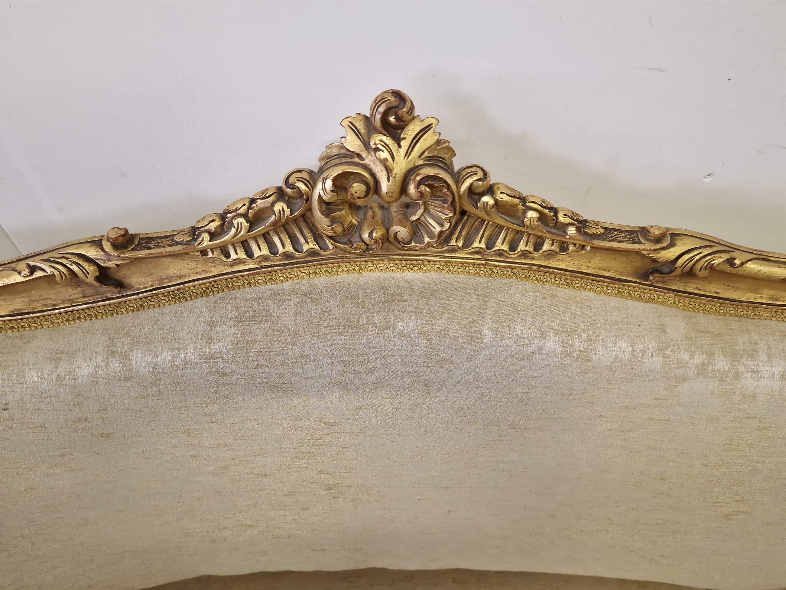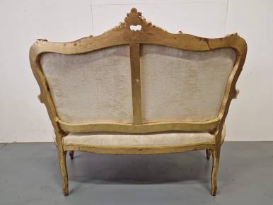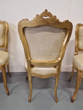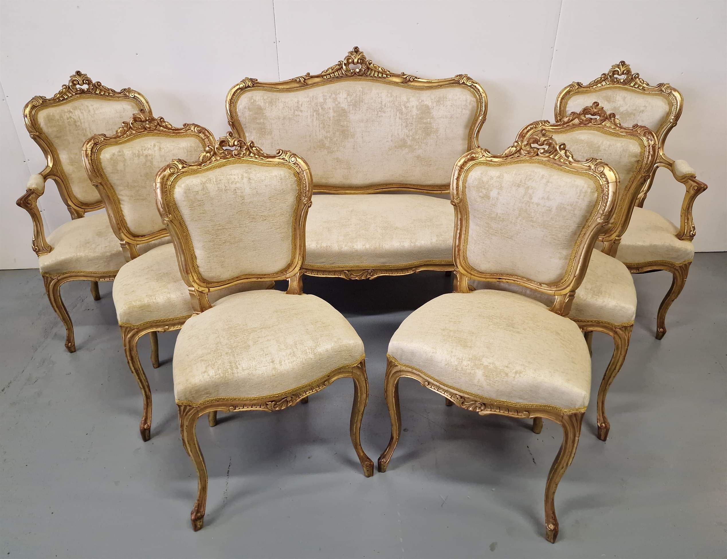 Izsmalcināts un skaists dīvāns ar 6 krēsliem. Valrieksts, apzeltījums, restaurēts, grebts koks. Itālija. 1920. gadi. Dīvāna izmēri: augstums 103; 46 cm; garums 129 cm; dziļums 58 cm