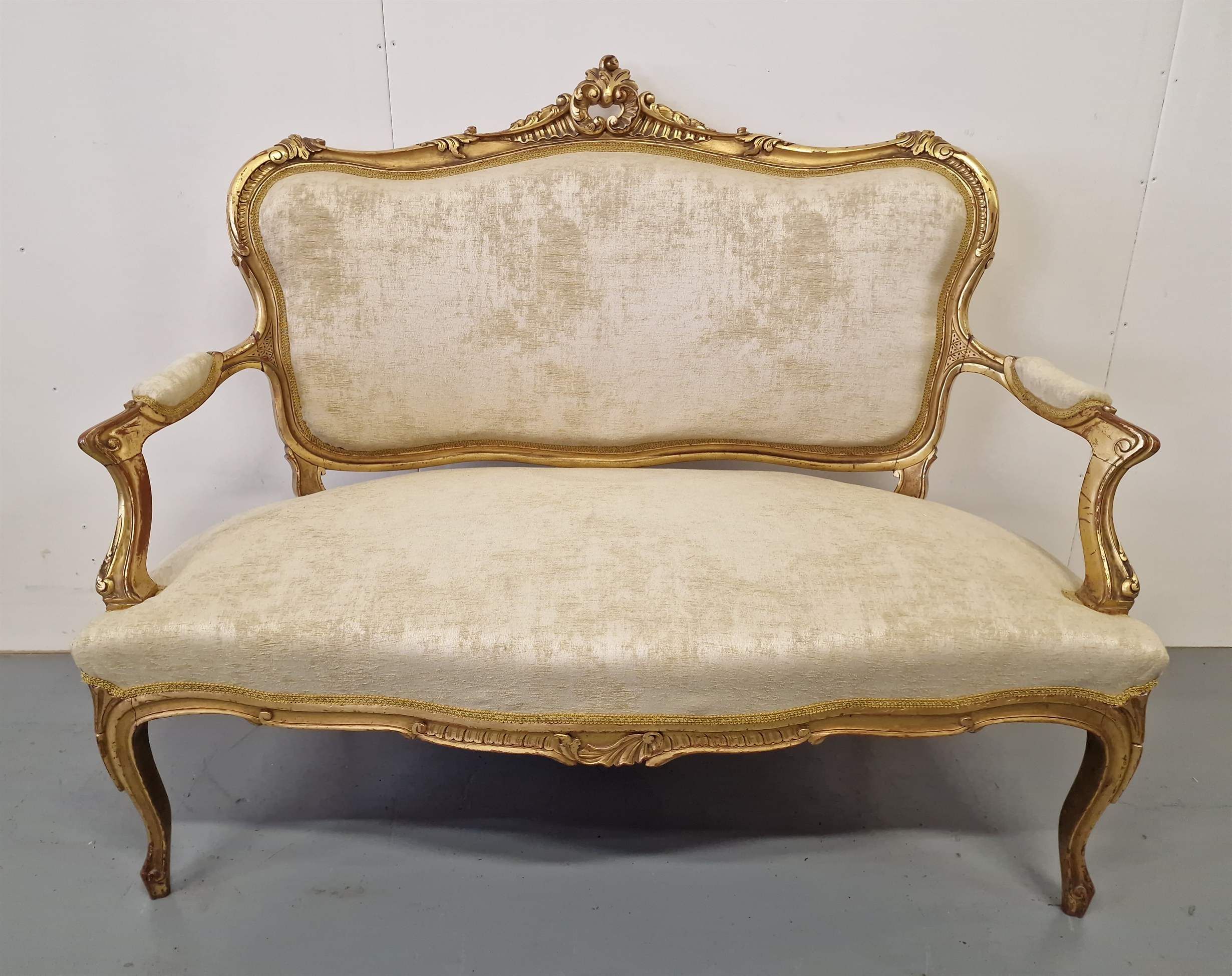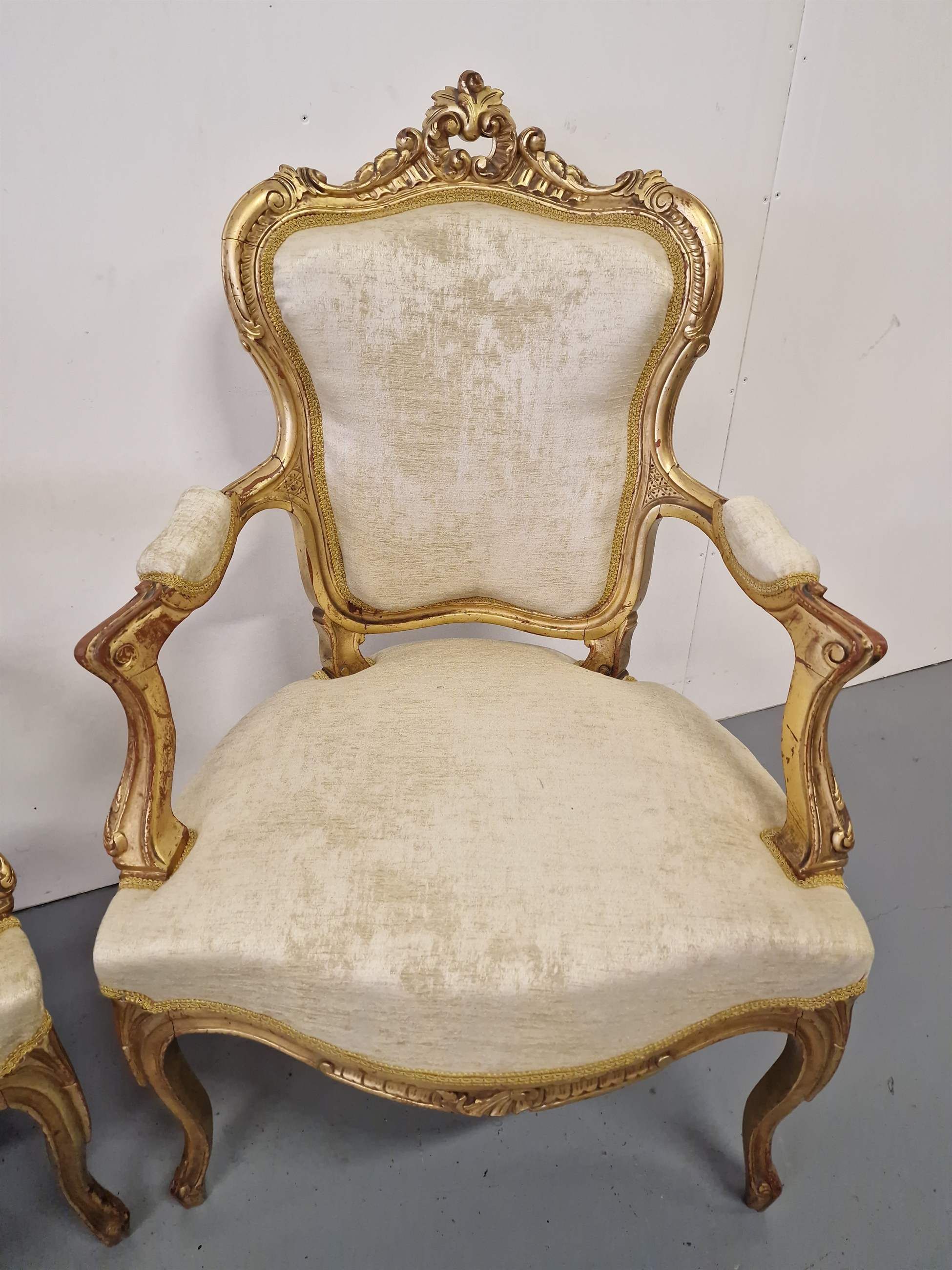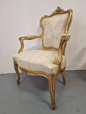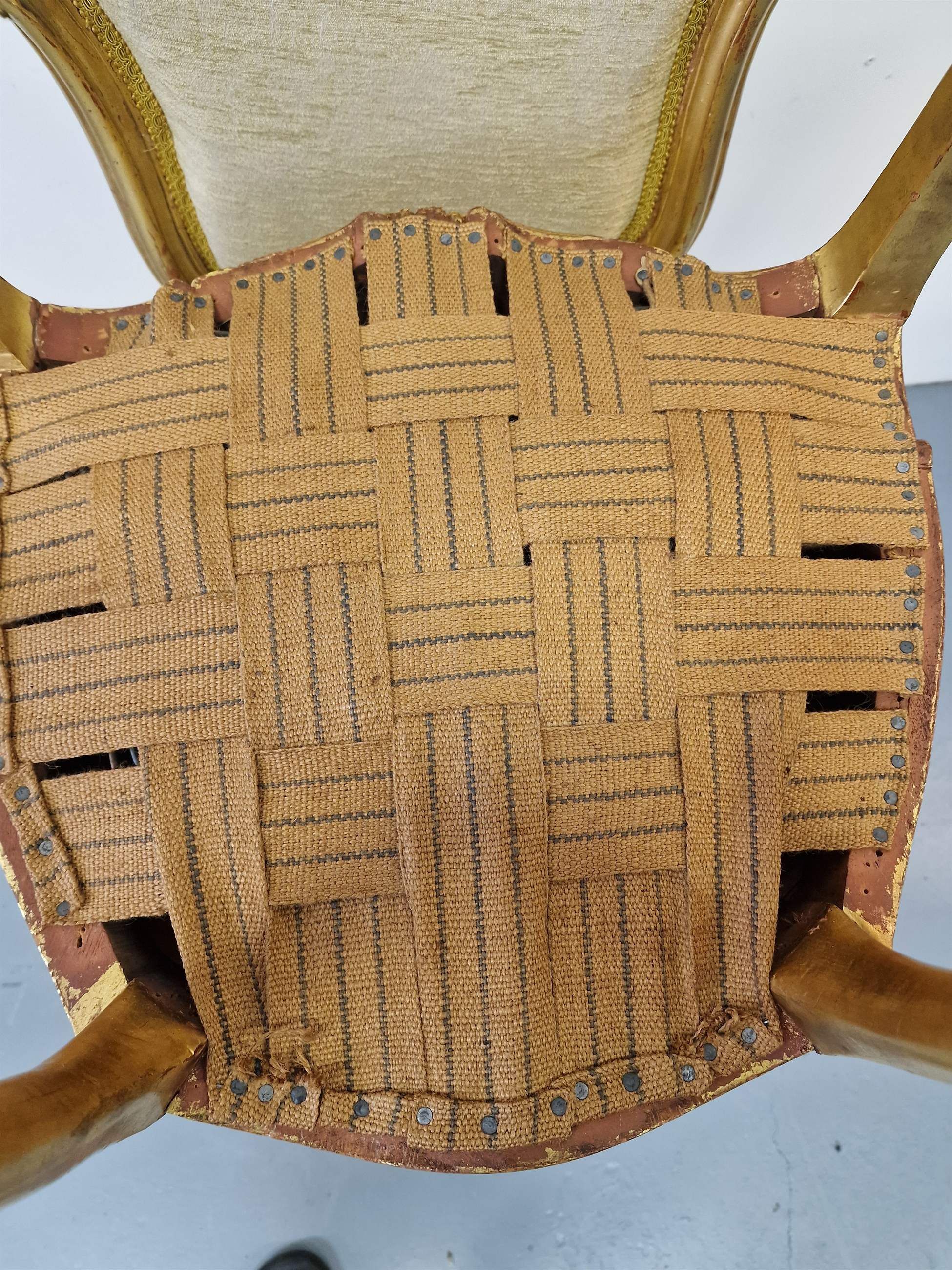 Izsmalcināts un skaists dīvāns ar 6 krēsliem. Valrieksts, apzeltījums, restaurēts, grebts koks. Itālija. 1920. gadi. Dīvāna izmēri: augstums 103; 46 cm; garums 129 cm; dziļums 58 cm
