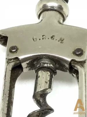 Антикварный штопор реечного типа с литым открытым корпусом и рукояткой с пружиной. Клеймо производителя "D.R.G.M"