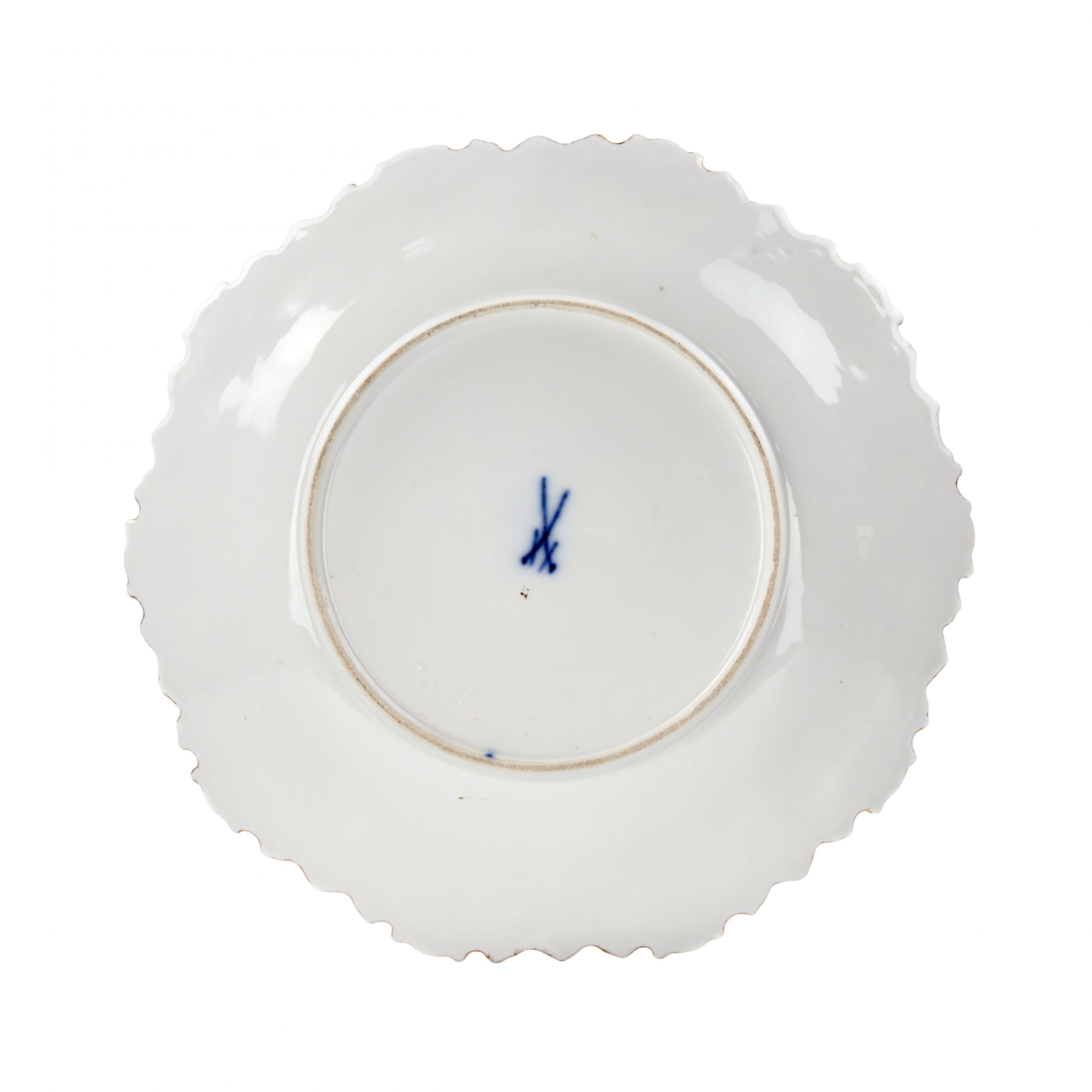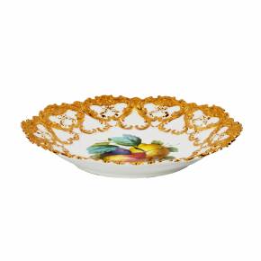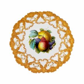 Декоративное блюдо Meissen с фруктами и широкими золотыми полями, по белому фарфору. Клеймо производителя: Meissen. 20 век. Диаметр: 26.5 см.