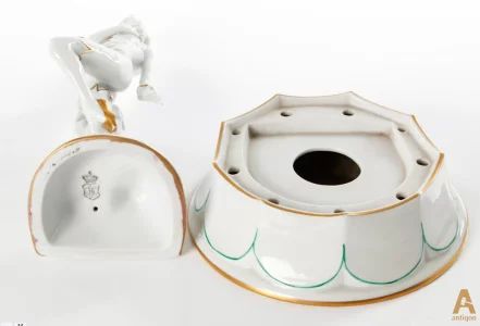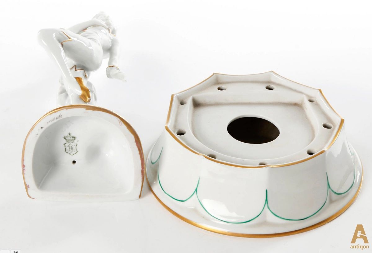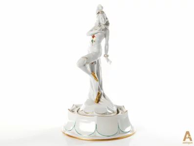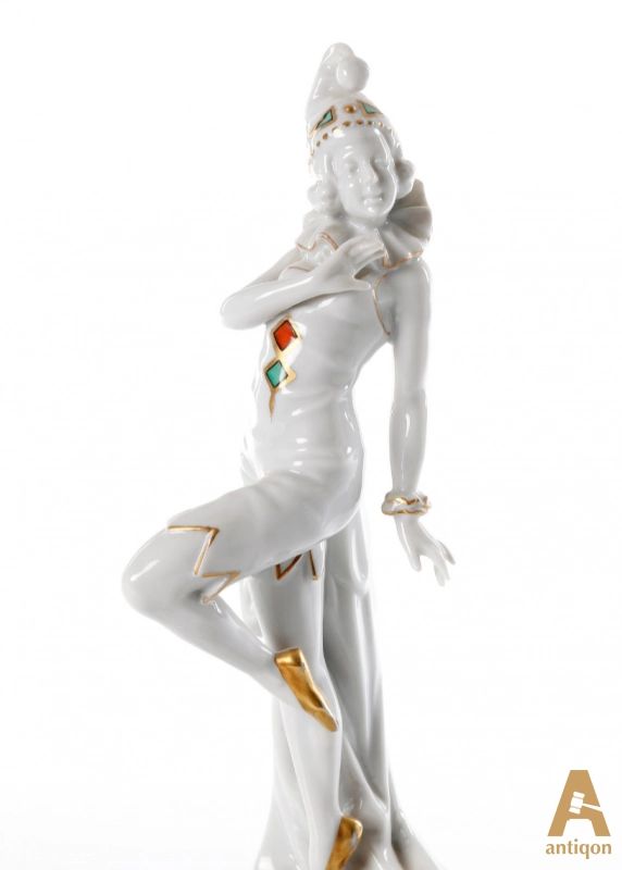 Porcelāna figūra "Meitene Arlekīna kostīmā", sastāv no pjedestāla un meitenes figūras. Ražotāja zīmogs.