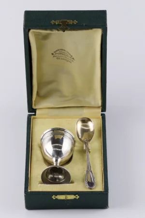 Серебряная пашотница с ложечкой в подарочном кофре. Клеймо: изображение"Минерва"в щитке. Общий вес изделий: 24 гр.