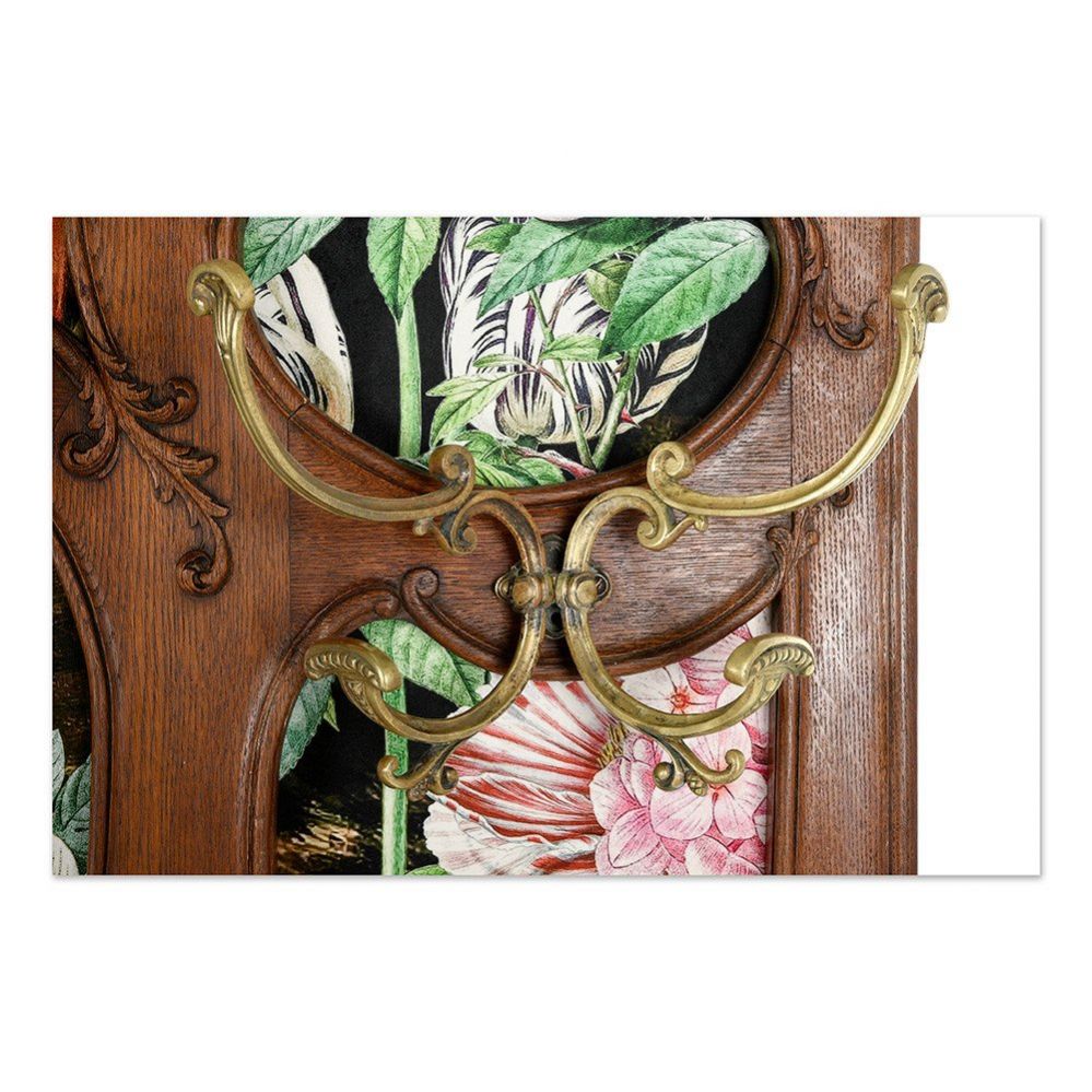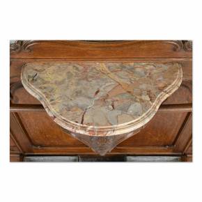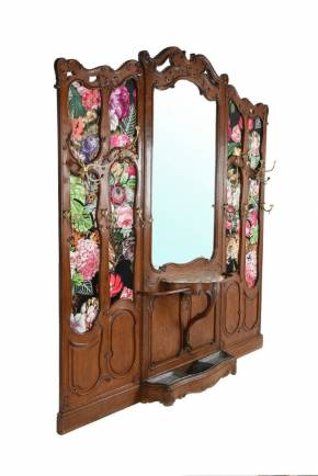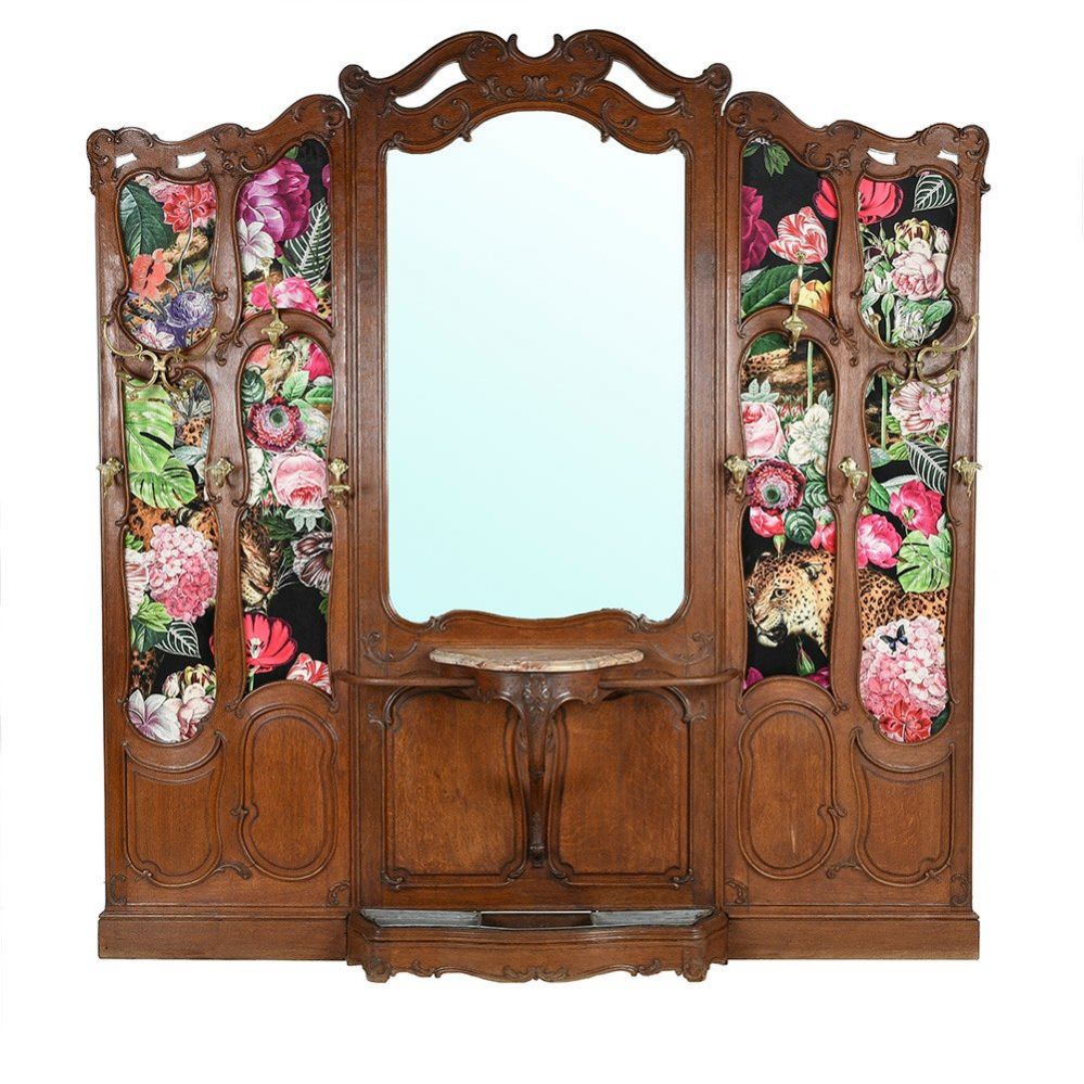 Вешалка с зеркалом украшенная резными элементами и тканью с изображением животных. Франция конец 19 века.
