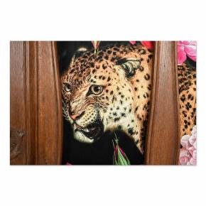 Pakaramais ar spoguli, kas dekorēts ar grebtiem elementiem un audumu, kurā attēloti dzīvnieki. Francija, 19. gadsimta beigas.