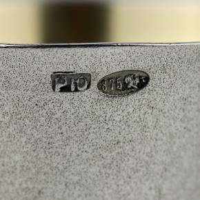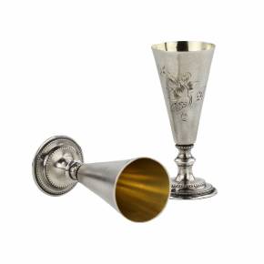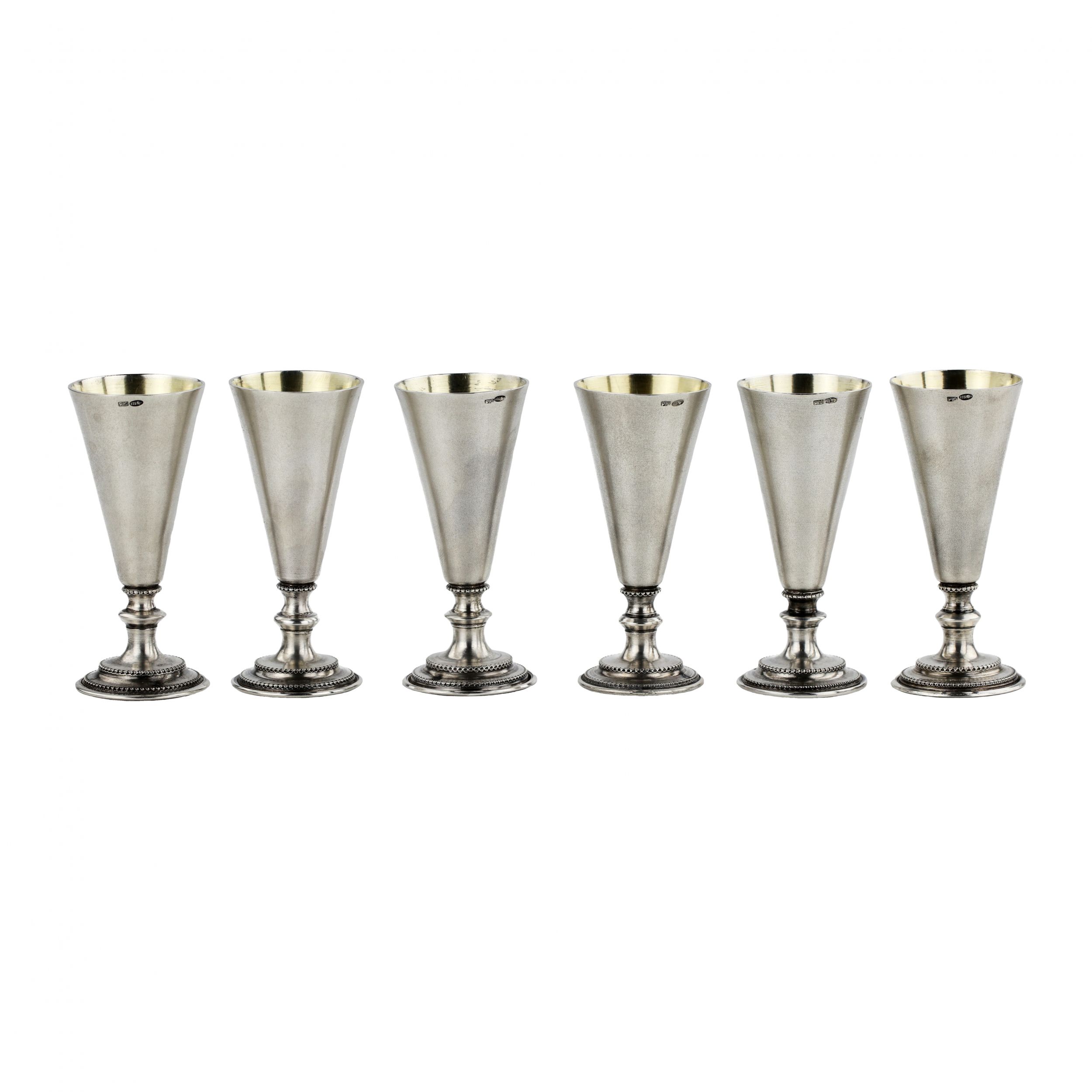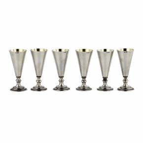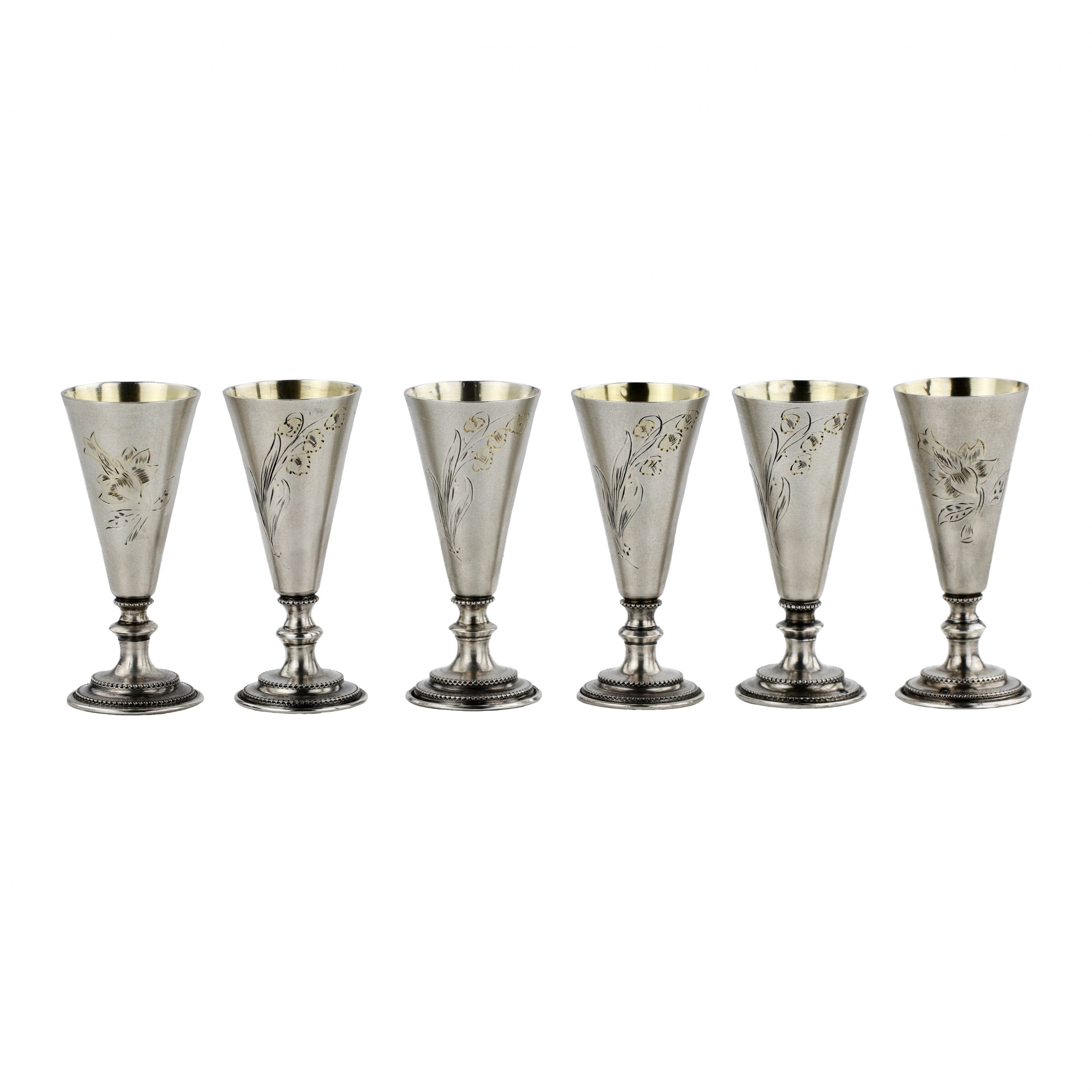 Sešu sudraba glāžu komplekts savā futrālī. Rīgas juvelierizstrādājumu fabrika 1940.-50.gadi. Katru konusveida glāzi uz kāta rotā smalks maijpuķītes zariņa gravējums. Rīgas juvelierizstrādājumu fabrikas padomju zīmoli pēckara periodā, līdz 1958.g. Stikla augstums: 7 cm Kopējais svars: 120 gr.