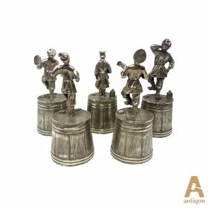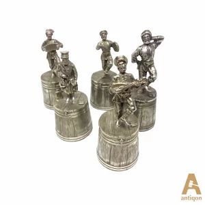 Выполненные в виде деревянных кадок и фигурок веселящихся мужчин.