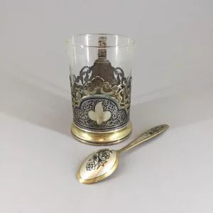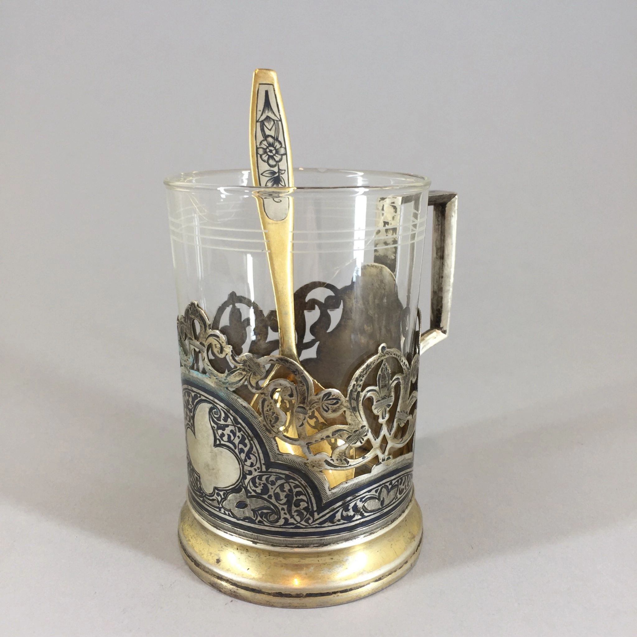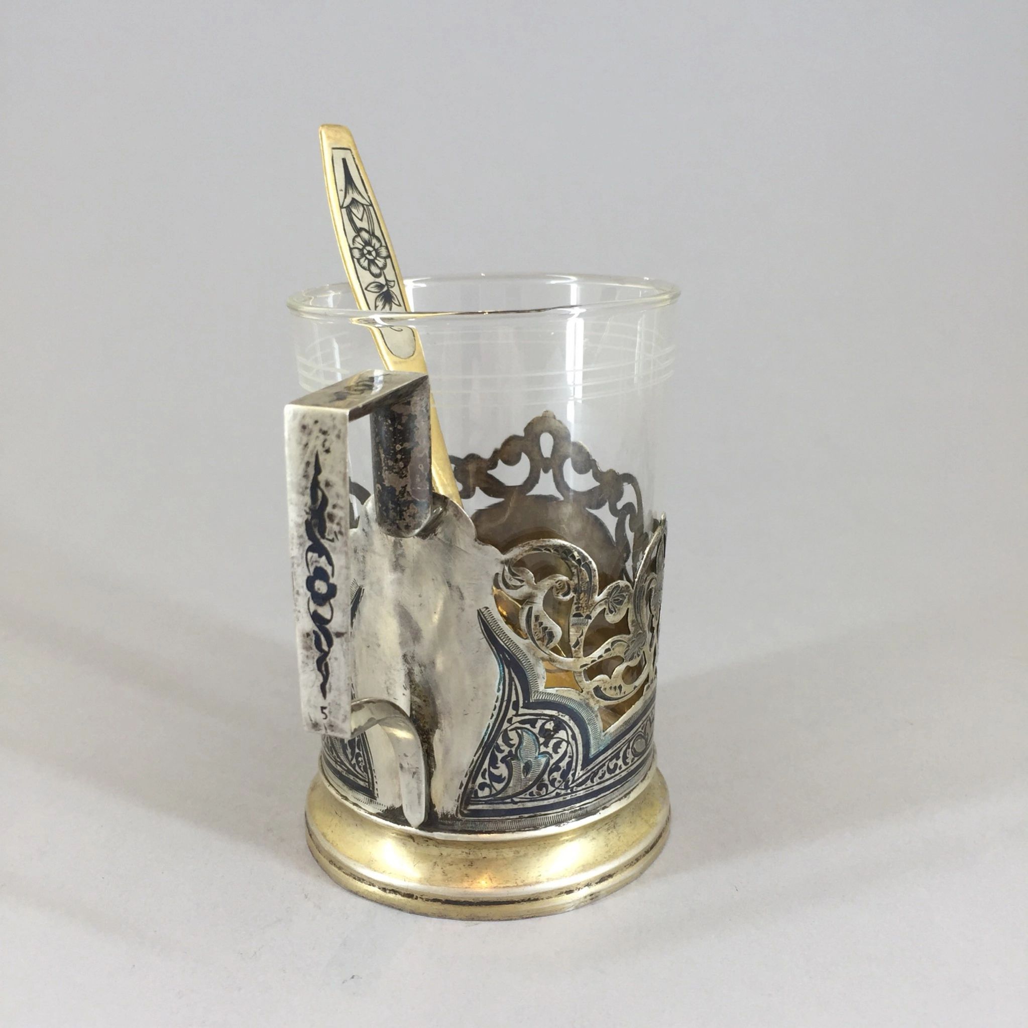 Серебряный подстаканник "Кубачи" со стаканом и серебряной ложечкой украшенной чернью.
