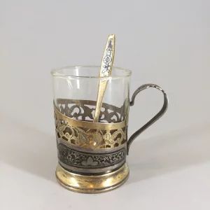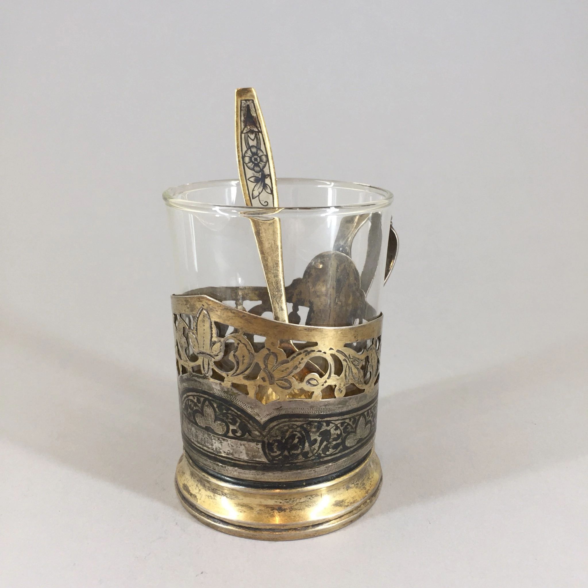 Серебряный подстаканник "Кубачи" со стаканом и серебряной ложечкой украшенной чернью.
