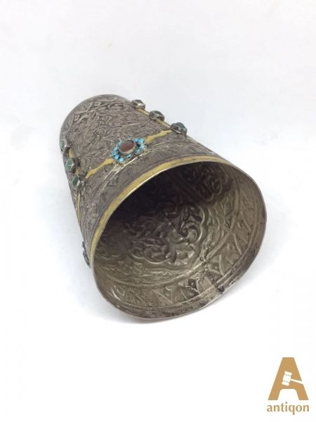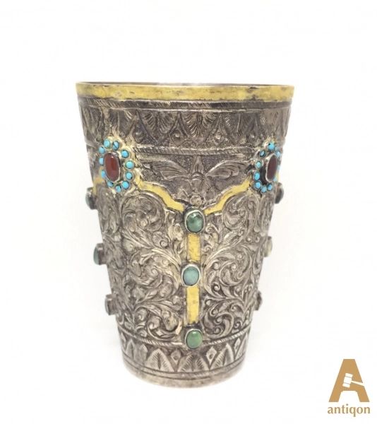 Серебряная чарка, богато украшенная позолотой, чеканным узором и натуральными камнями Изумрудами, Яшма, Бирюза огранки Кабошон. Клеймо: Silv. Вес 151гр.
