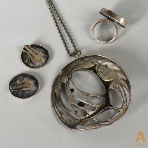 Sudraba komplekts "KARL LAINE". Komplektā: auskari, gredzens, kaklarota. Autors: KARL LAINE. 1972.g. Kopējais svars 50gr.