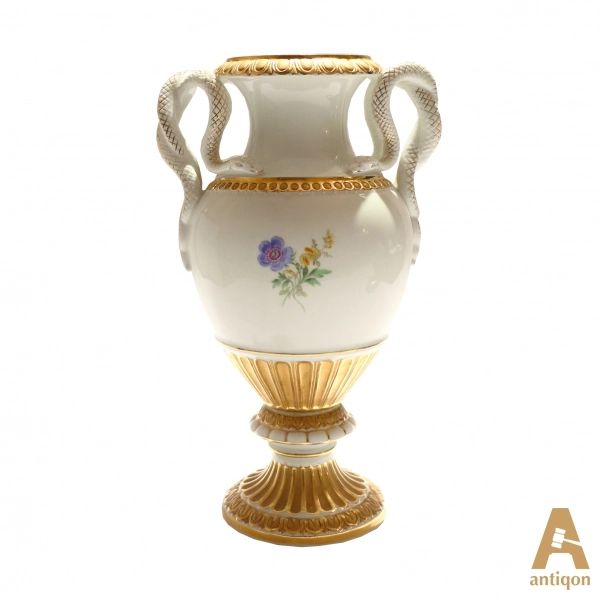 Ваза Мейсен(Meissen),украшенная ручками в виде змей, позолотой и цветами.Клеймо производителя:подглазурный синий знак мануфактуры Meissen"Скрещенные Мечи" ,соответствующий 1933 г.