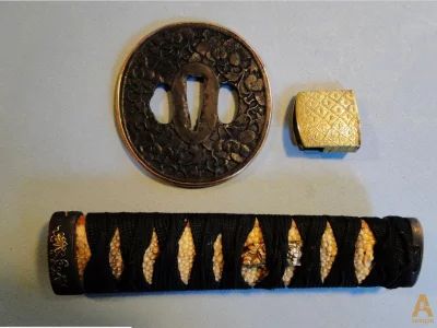 Превосходный антикварный японский меч Wakizashi около 17-18 вв.Превосходное лезвие чрезвычайно острой заточки - подписан «NOBUYOSHI»( НОБУЮШИ )Предположительно мастер NOBUYOSHI, принадлежал к школе Mishina, его настоящее имя - Такай Кинзабуро, жил в Абура-но-коджи, Киото. Так же у мастера было два брата Echizen-no-kami NOBUYOSHI и Awa-no-kami NOBUYOSHI, они переехали в Сетцу Осаку, три брата работали кузнецами и изготавливали мечи в Киото и Осаке. Подпись выложена золотом, что может указывать на режущий тест или атрибуцию - возможна принадлежность , к Ямасиро Нобуоши, который работал на рубеже 17 -18 века . Отличительное превосходство меча это тяжелое лезвие которое весит 620 грамм.Сая (ножны) прекрасно сохранилась - вся покрыта черной лаком и украшена драконами из золота и красной эмали - очень качественная и редкая работа.Нож Kozuka и Kogai соответствуют дизайну дракона - Kozuka имеет длинную подпись, на клинке,а так же подпись на медной части (задней части ручки).Ручка с подходящими Фучи и Каширой украшена сложным цветочным узором - железная Цуба украшена цветочными узорами и имеет бронзовую раму.Ручка с обернутым лучом-кожей имеет один Menuki в форме мифического зверя в позолоченной бронзеОбщая длина составляет 72,3 см - лезвие имеет длину всего 67,5 см с режущей кромкой длиной 53 см. Вес лезвия составляет 620,4 грамма. Козука имеет длину 21,5 см, а Когай - 20,7 см. Общий вес, включая крепления, составляет 1087 грамм