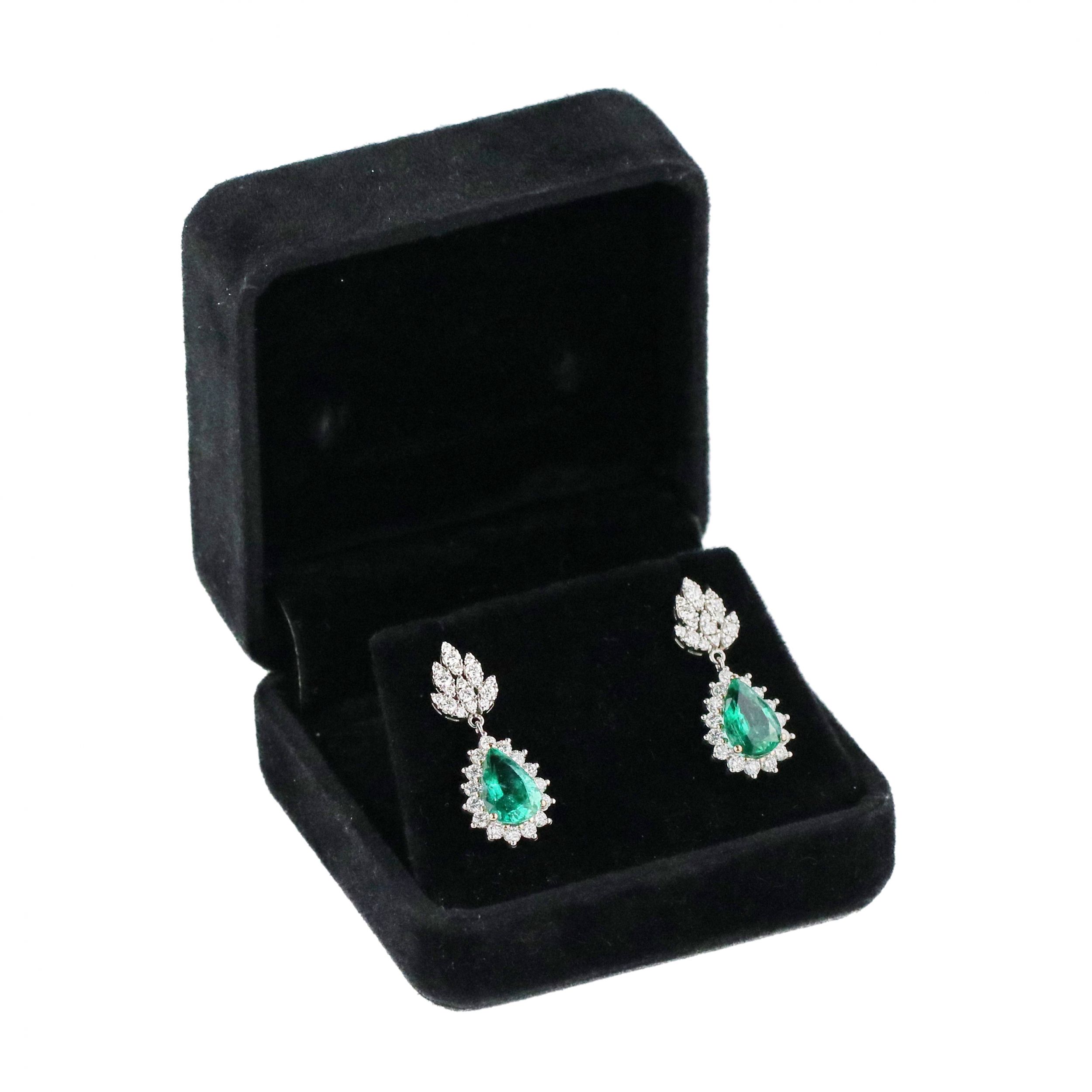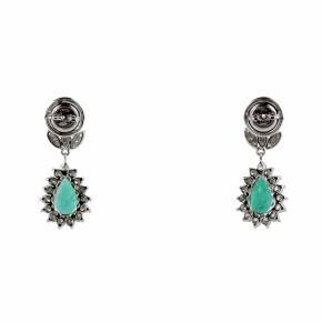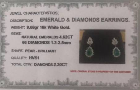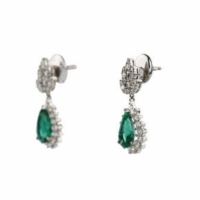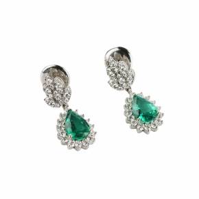 Izteiksmīgi, zelta auskari, klasisks dizains, ar smaragdiem un dimantiem. 18 karātu baltais zelts. Smaragdi: 4,62 karāti. 66 dimanti 2,30 karāti. HVS1. Kopējais svars: 9,68 gr. Ar sertifikātu.