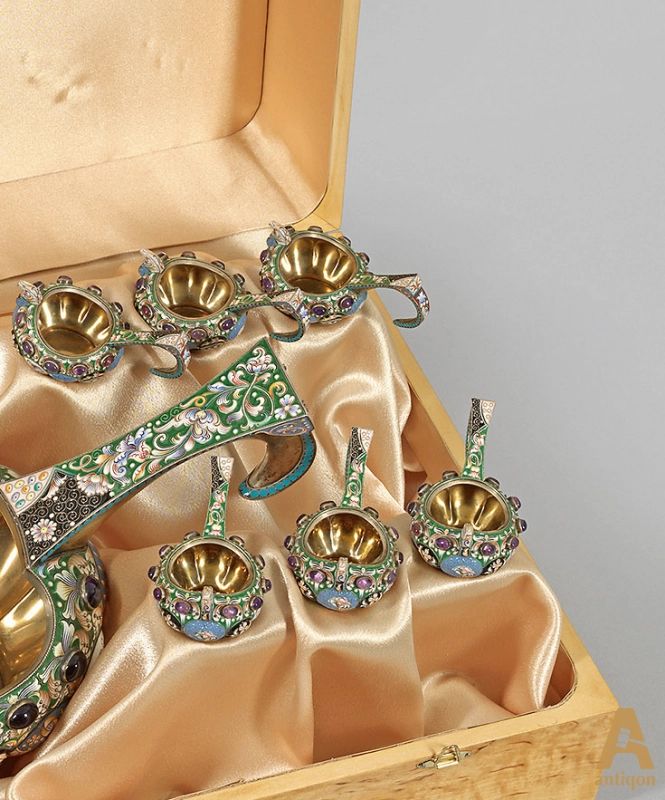Серебряный ковш с элементами эмали, с шестью стаканами ,украшенные аметистами , в оригинальной деревянной коробке. Общий вес 1600гр.