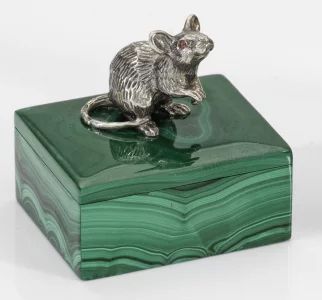 Шкатулка из малахита выполненная в стиле Карла Фаберже,украшенная серебренной фигуркой мышки с глазками из гранатов. Клеймо: цифры"84"