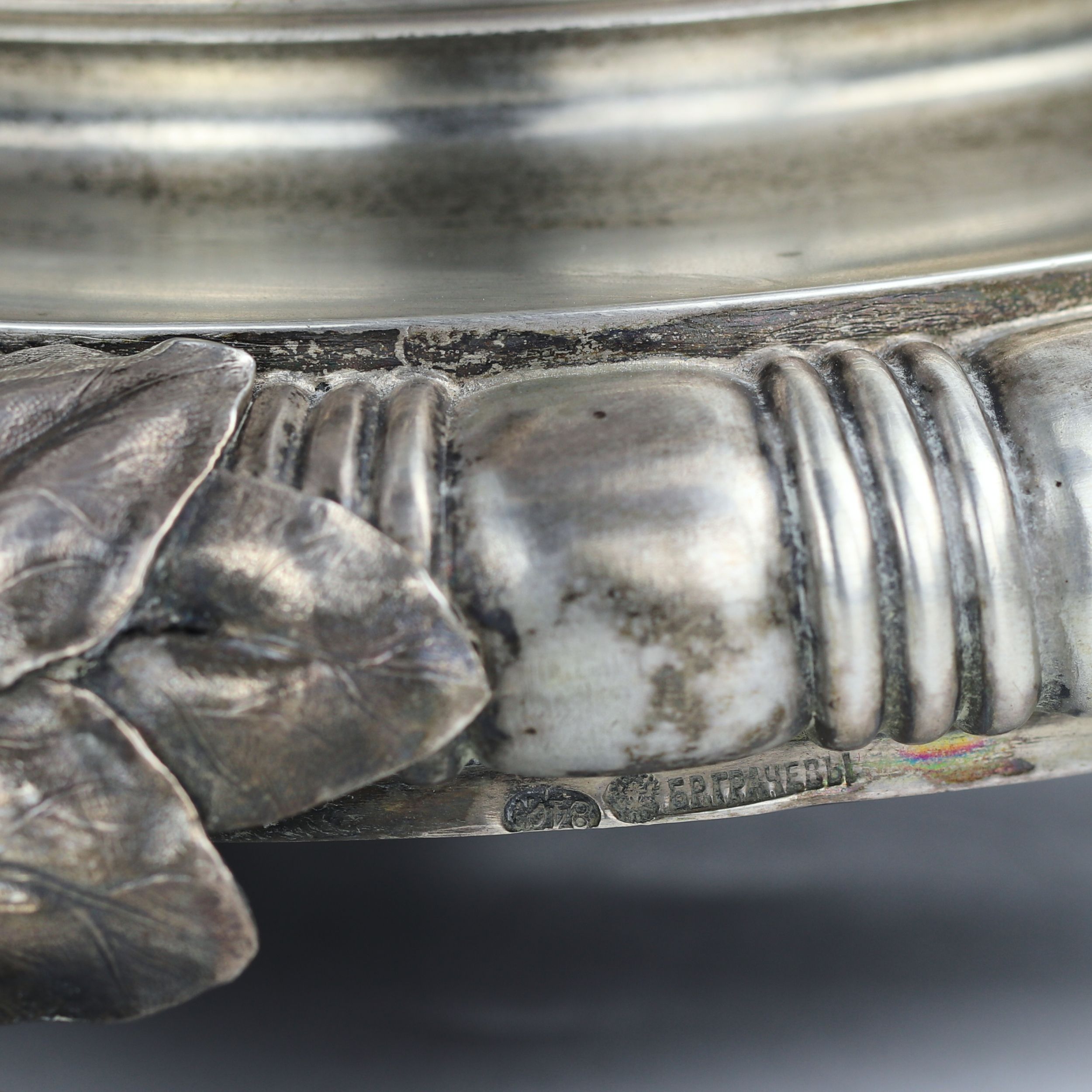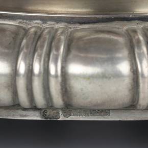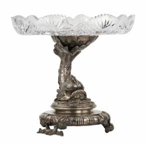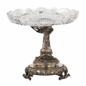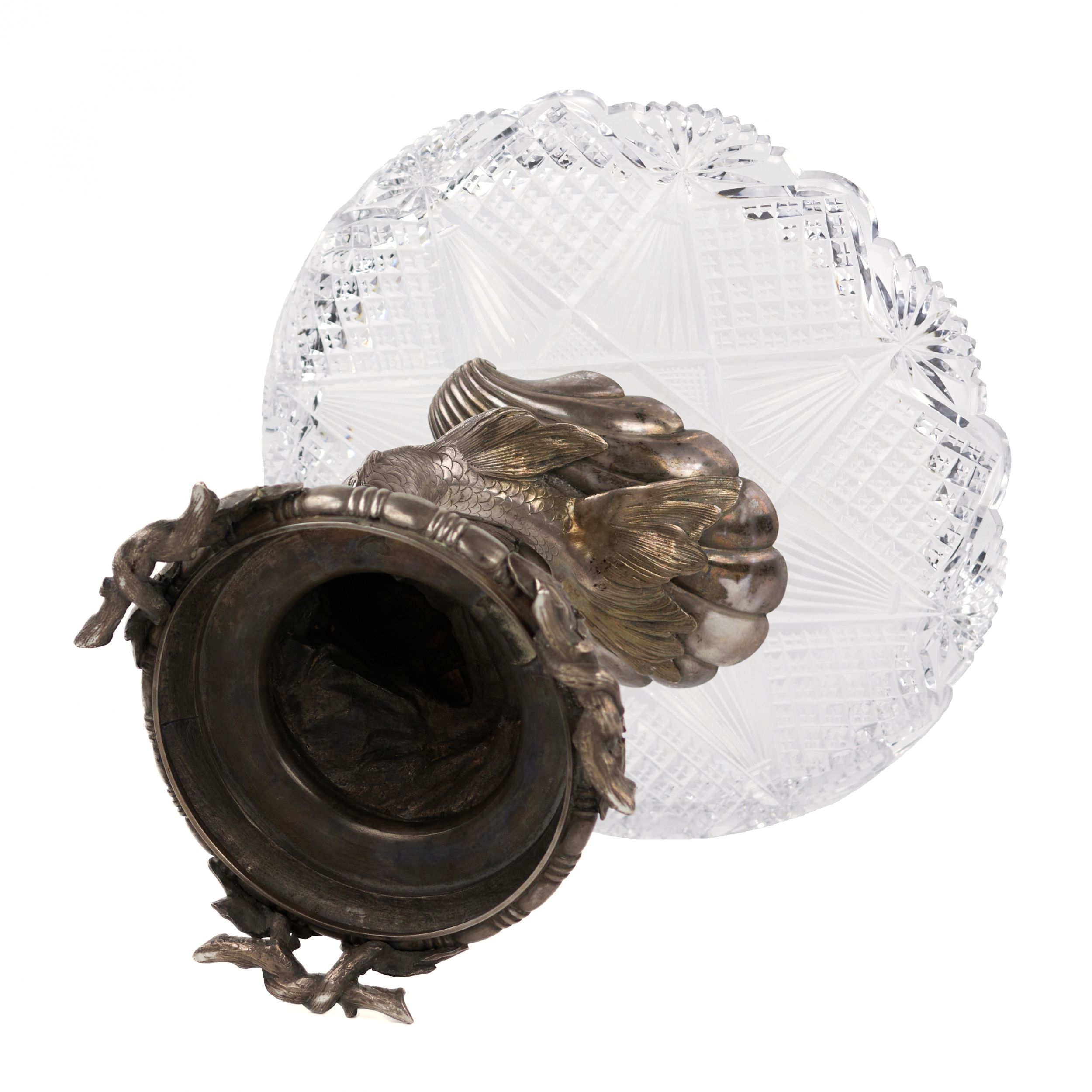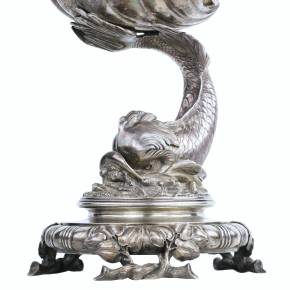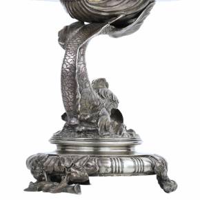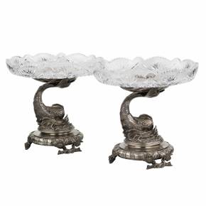 Эта великолепная пара ваз-тацци представляет собой уникальный пример изысканного мастерства знаменитой фирмы Братья Грачевы — поставщиков Императорского двора. Серебряные ножки выполнены в виде стилизованных дельфинов, чешуя которых изящно выгравирована, а хвостовой плавник держит раковину, служащую основанием для стеклянной чаши. Ножки покоятся на трех витых ветвях, декорированных листьями, подчеркивая утонченность формы и композиции.На изделиях стоят клейма Санкт-Петербургского пробирного управления, знак 84-й пробы, соответствующий последней четверти XIX века, герб Санкт-Петербурга, а также полное клеймо производителя — кириллическая надпись Бр. Грачевы с двуглавым орлом.Материал : Серебро ,Чеканка, золочение . Размеры:Высота: 23 см и 25,5 см (включая чашу),Диаметр стеклянной чаши: 28,8 см. Общий вес без стеклянной части: 3944 г.Эти изделия не только демонстрируют высочайший уровень мастерства российских ювелиров, но и служат великолепным примером художественных традиций и стиля эпохи конца XIX век