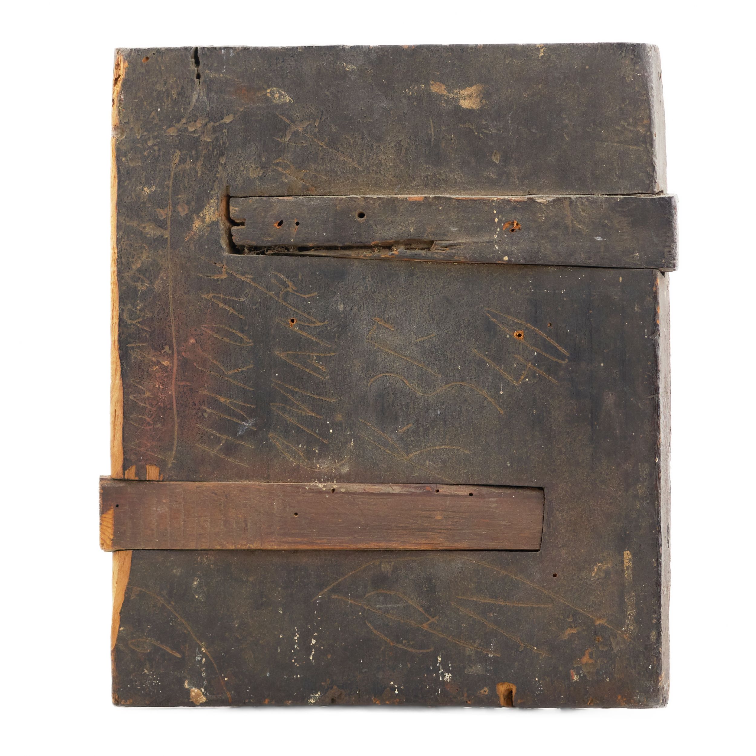 Состояние: Удовлетворительное. Наблюдаются утраты и истирания красочного слоя, кракелюр, следы бытования по полям и на фоне, локальные потемнения и утраты левкаса. Доска с обратной стороны имеет следы старых креплений и бытового подвеса.