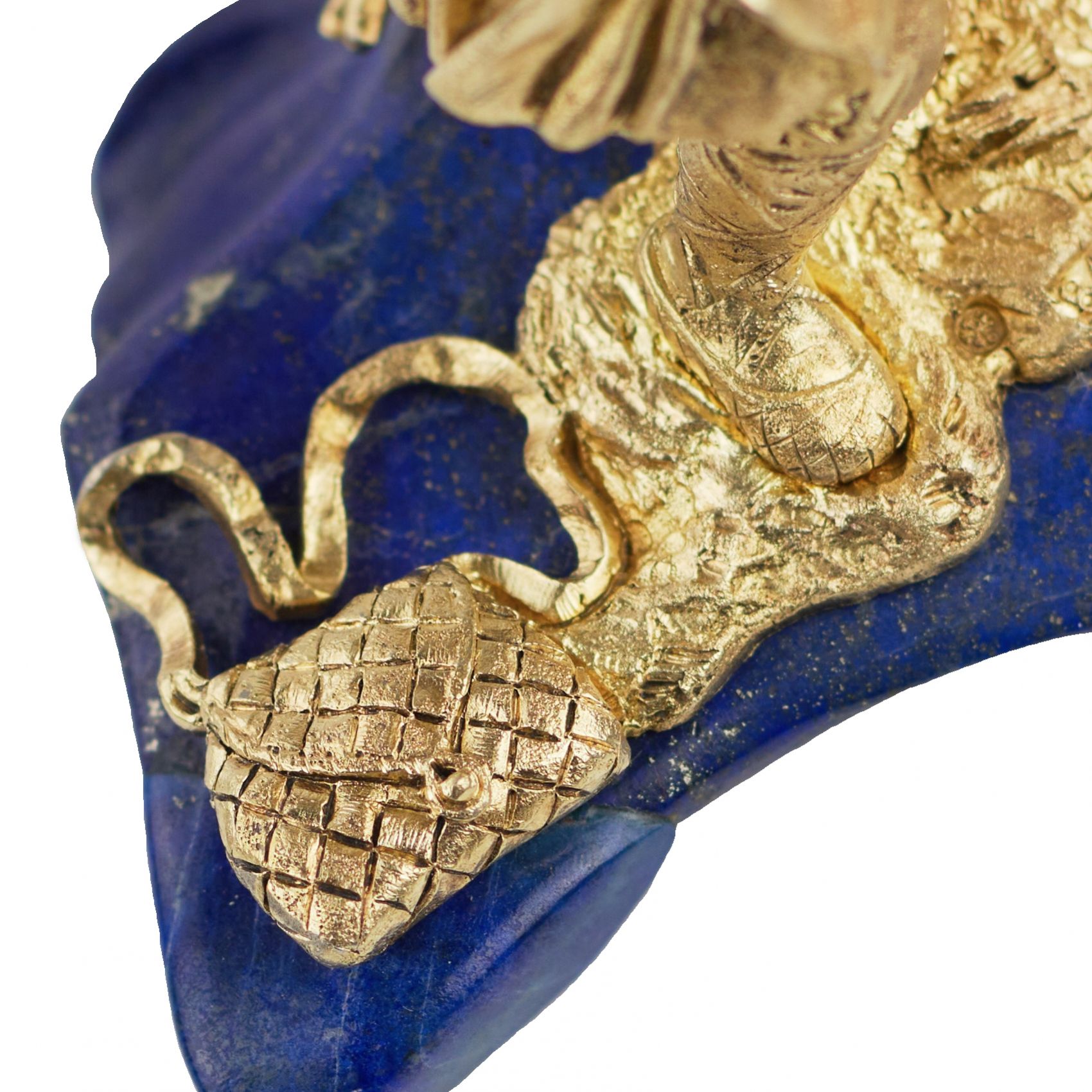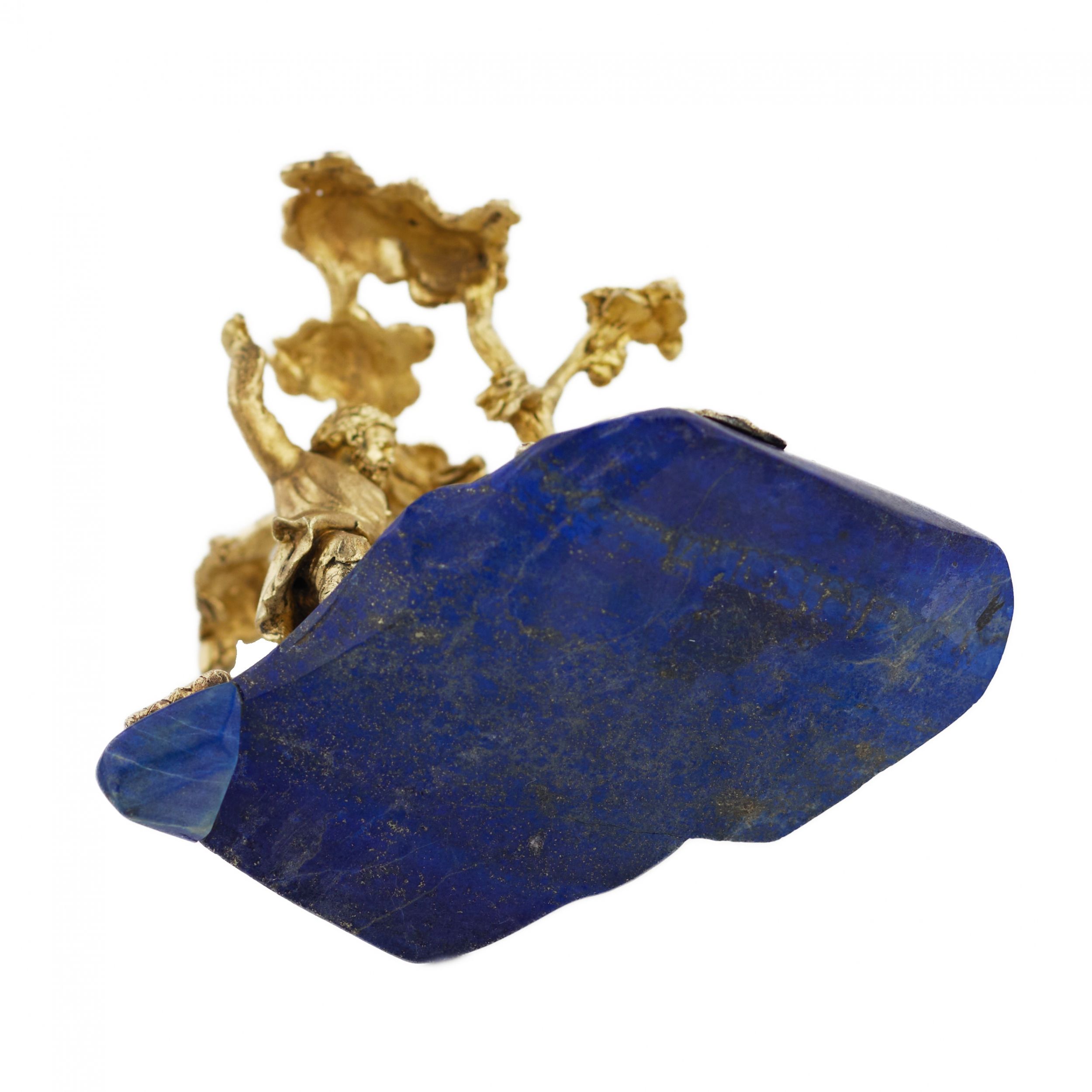 Контраст глубокого синего лазурита и золочёного металла придаёт композиции выразительный декоративный характер, типичный для художественных изделий петербургских мастерских второй половины XIX века.