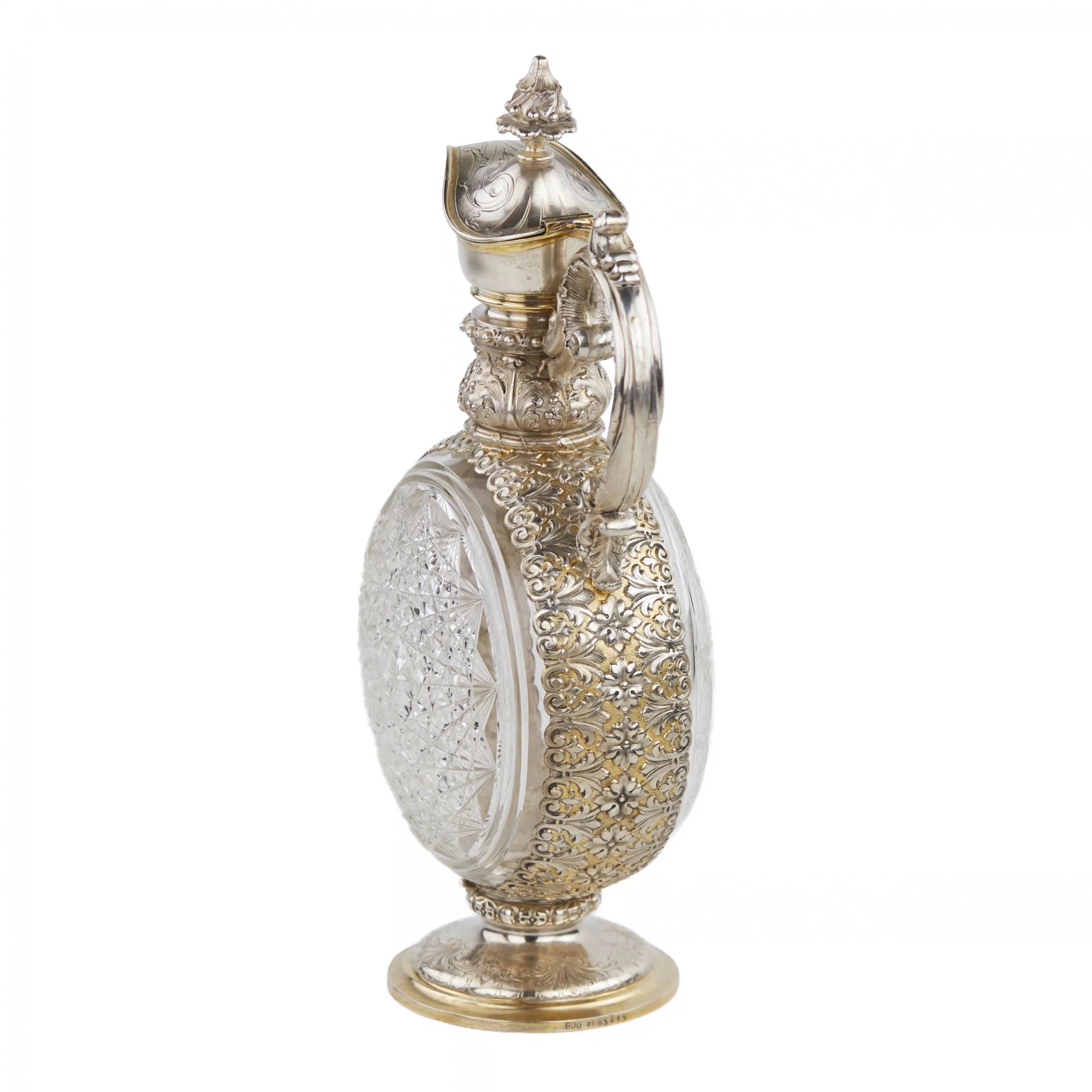 По окружности корпусов проходит широкий ажурный серебряный пояс с рельефным орнаментом из стилизованных цветов и растительных завитков. Кувшины установлены на круглые основания с гравированным декоративным поясом. Сочетание тяжёлого резного хрусталя и художественно обработанного серебра придаёт предметам парадный характер и делает их эффектными элементами сервировки.