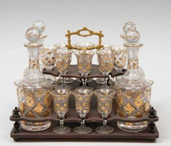 Дорожный бар в стиле Boulle Период Наполеона III, 19 век.Резное дерево, шпон палисандра, латунь и перламутр.Размеры: 27,5 х 33 х 24 см.Шкатулка для ликера из дерева со шпоном палисандра, перламутра и позолоченной латуни, которая имеет простой дизайн и прямые линии с прямоугольной структурой. Изделие имеет сдержанный декор, основанный на выразительности материала, но также украшено декоративными элементами спереди, как на корпусе, так и на крышке, выполненными в стиле классицизма на основе растительного орнамента. Комплект завершает ряд баночек из прозрачного стекла, украшенных позолоченными растительными мотивами.