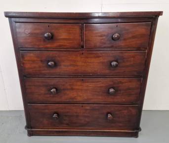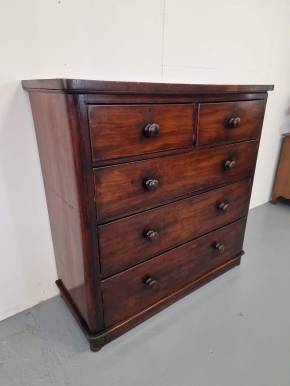 Large and antique chest of drawers. Mahogany veneer, elm. England. 1860s. Size: height 120cm; length 120cm; depth 50cm.