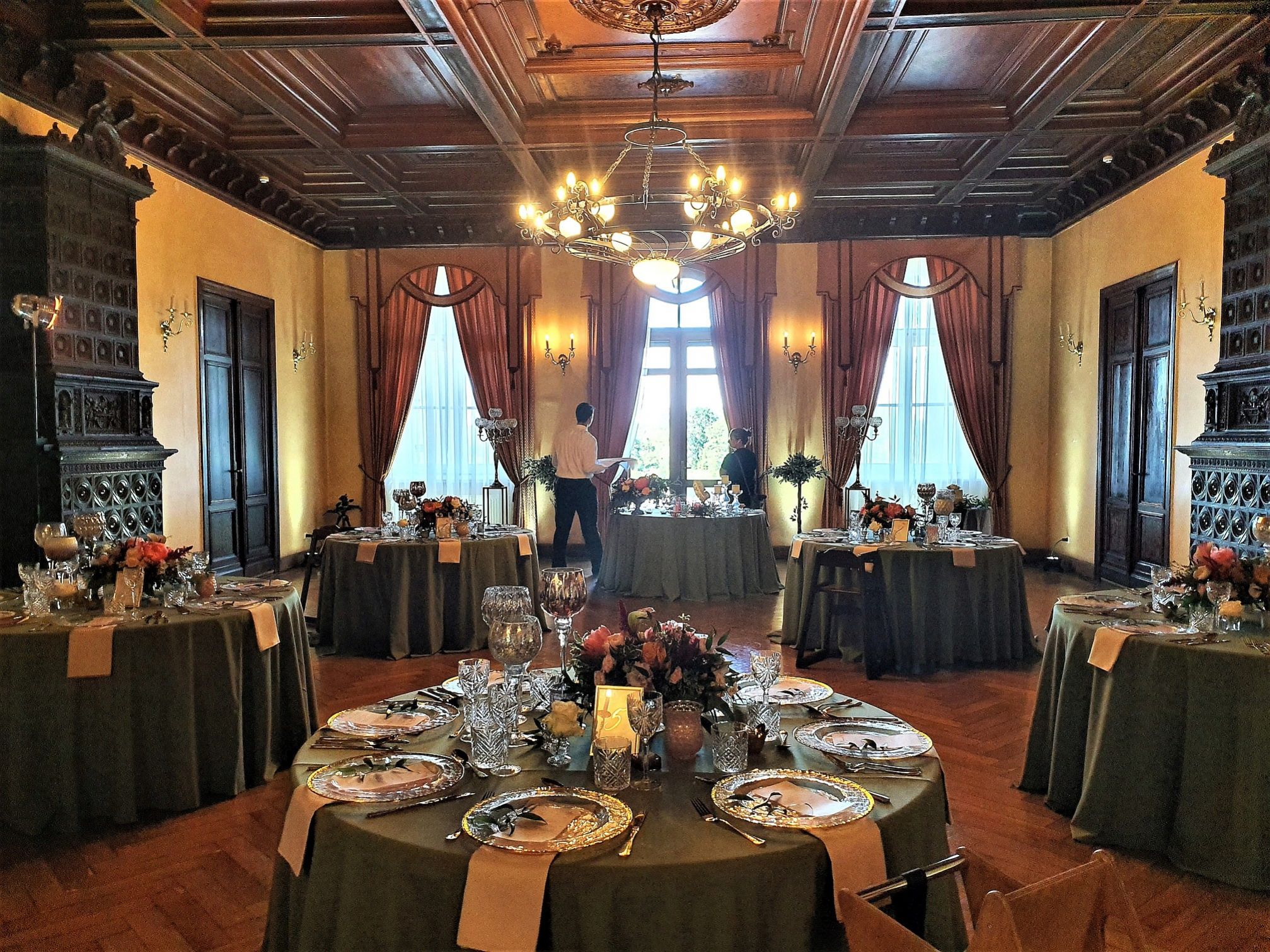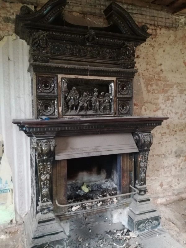 Редкий керамический камин конца XIX века, созданный рижской мануфактурой Zelm & Boehm, украшен выпуклыми рельефами в стиле неоренессанса. Облицовка выполнена из покрытых темно-зелёной глазурью изразцов, включая центральную берлинскую плитку — характерную рельефную панель, вставленную в нишу над топкой. Панно изображает сцену по картине Карла Беккера «Антон Фуггер сжигает долговые расписки Карла V перед императором» (1866, Национальная галерея, Берлин), выполненное по оригинальному художественному проекту Пауля Обста — архитектора, керамиста и ведущего дизайнера немецкой школы конца XIX века. Верхняя часть камина увенчана разорванным фронтоном, украшенным фигурами ангелов, орнаментами акантов и маскаронами.