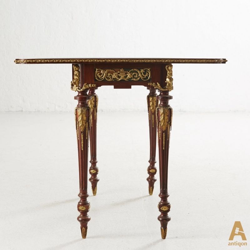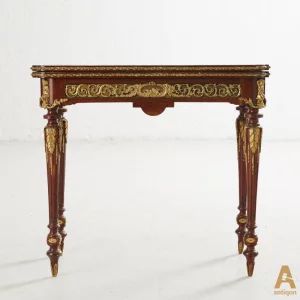 Карточный стол, богато украшенный элементами золоченной латуни и инкрустацией ценных пород дерева.