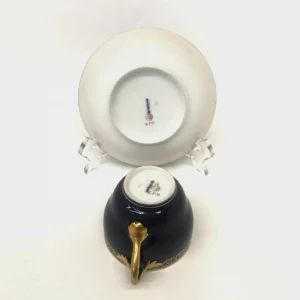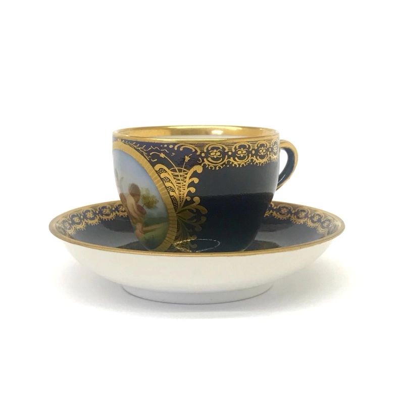 Фарфоровая кофейная пара с изображением Путти и Купидона садовников в медальоне на синим кобальте, знак «КПМ».Н-6,5см.
