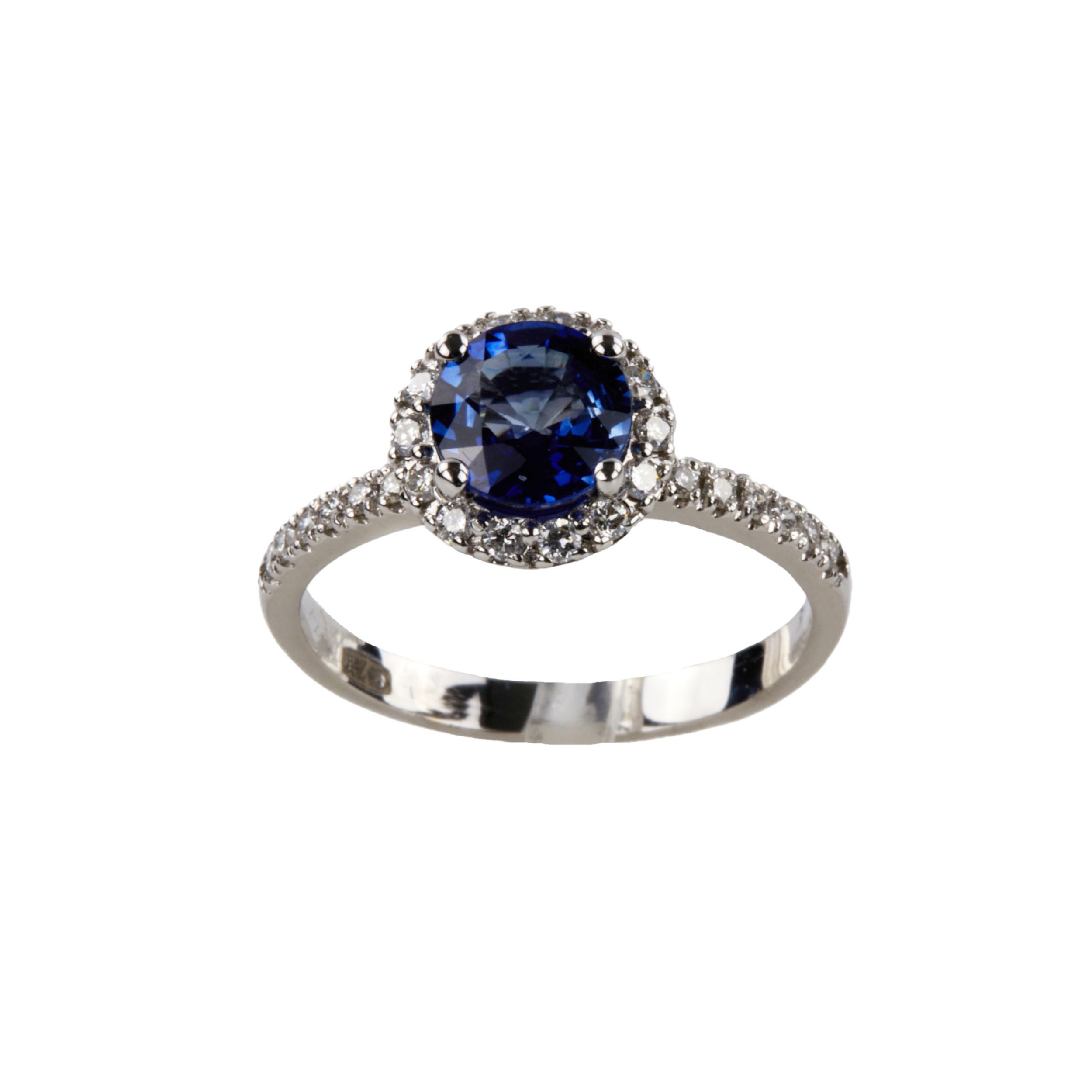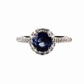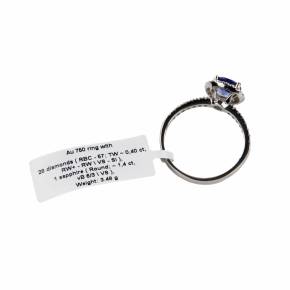 Кольцо белого золота 750 пробы с центральным голубым сапфиром 1,40 карата и бриллиантами 0,40 карата. VS Si. Современная латвийская проба золота и государственный сертификат на камни.