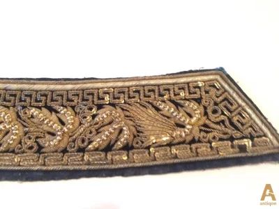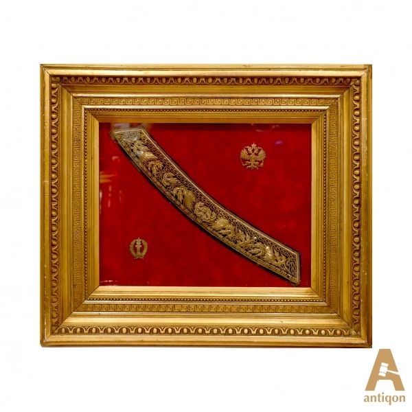 Композиция "Закон", состоящая из шитья, знака "Закон", герба Российской империи в виде двуглавого орла, установленные в раму под стекло.