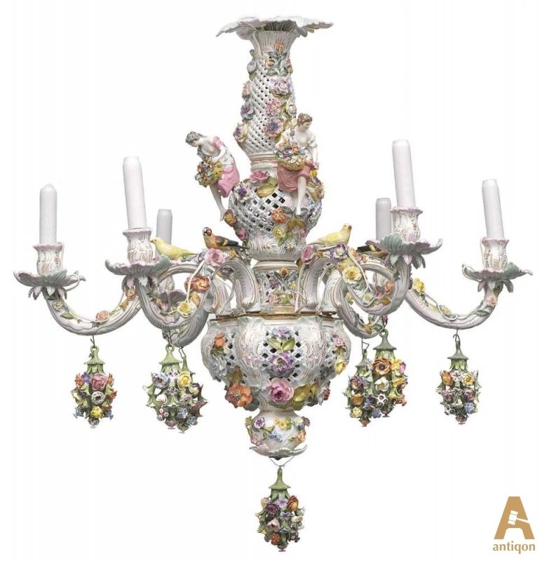 Люстра выполненная из фарфора украшенна фигурами девушек , птицами ,цветочными гирляндами. Шесть свечей. Электрифицирована.