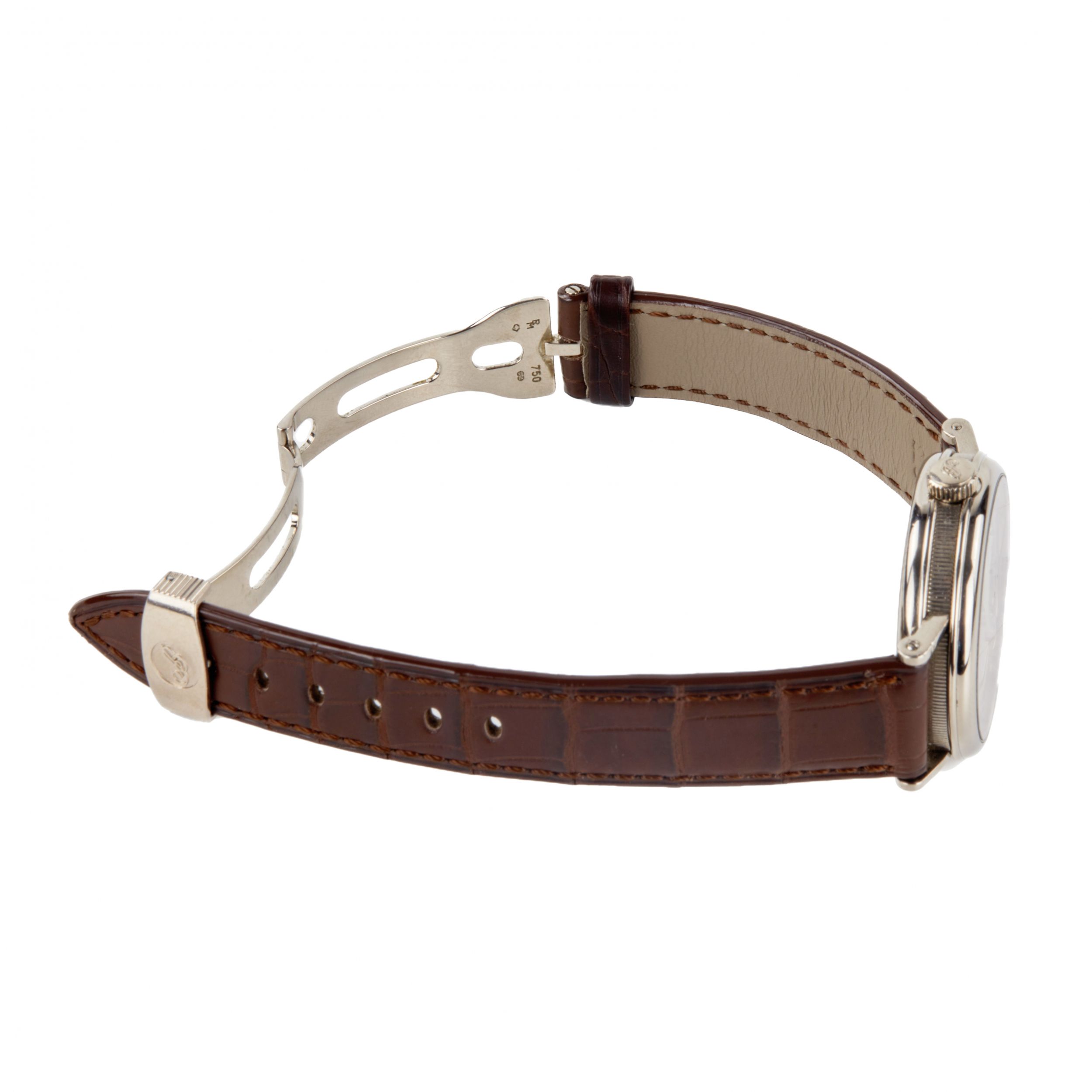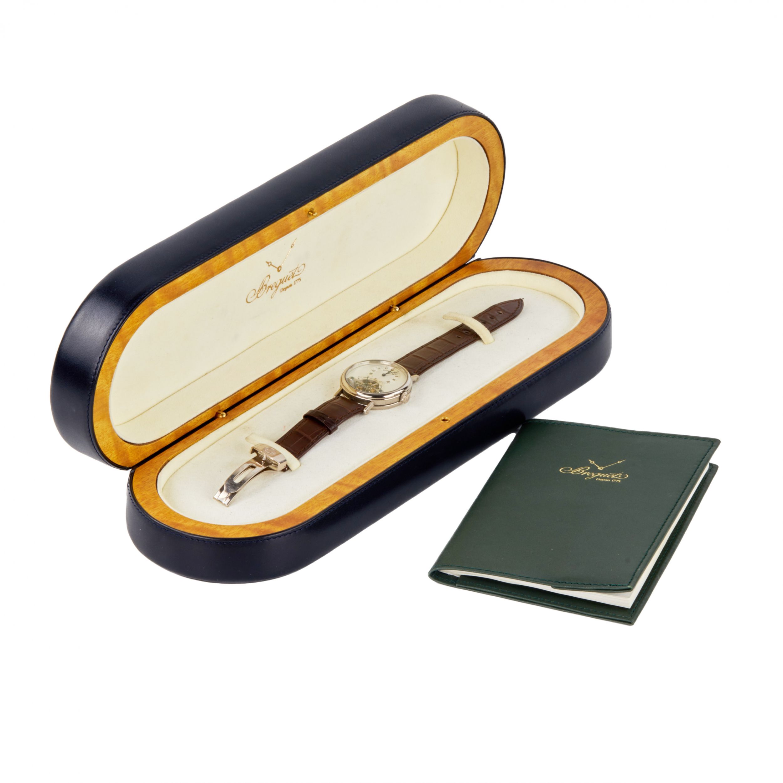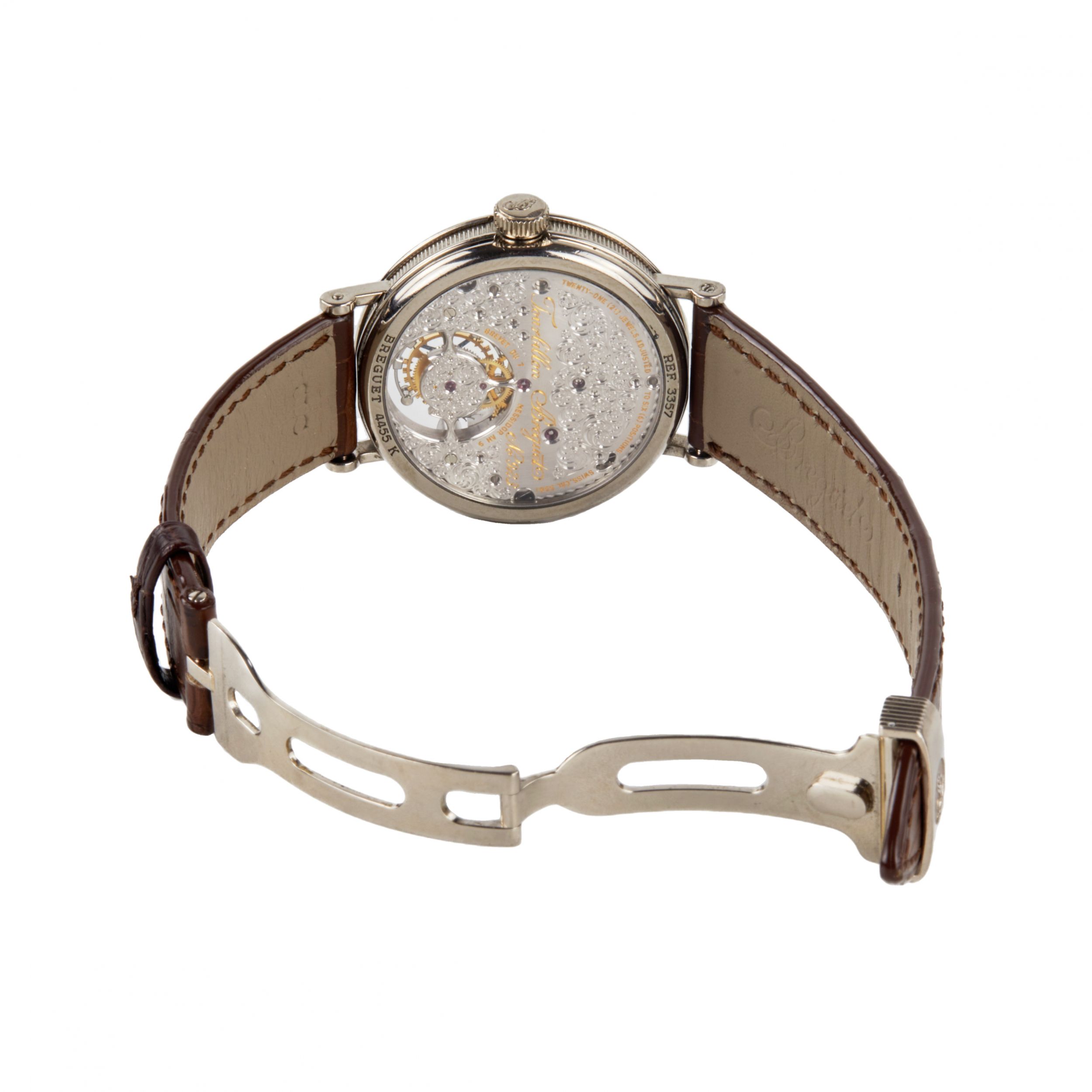 Уникальные мужские часы марки Breguet Tourbillon Classique Grande Complications выполнены из 18-каратного белого золота. Диаметр корпуса 36 мм. Циферблат украшен серебряной, гильошированной эмалью и фирменными воронеными стрелками в стиле Breguet . Механизм с ручным заводом и 50-часовым запасом хода. Коричневый кожаный ремешок. Водонепроницаемость 30 метров. Номер референции 3357BB12986. В комплекте с коробкой и документами.