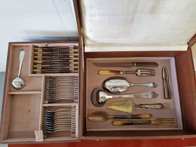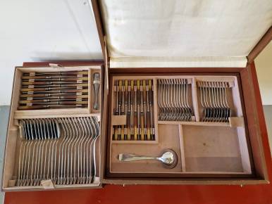 Набор столовых приборов из стали L.INOX. Отличное качество. 81 предмет. Франция. 1930-е годы. Размер коробки: высота 17 см; 43x33 см.