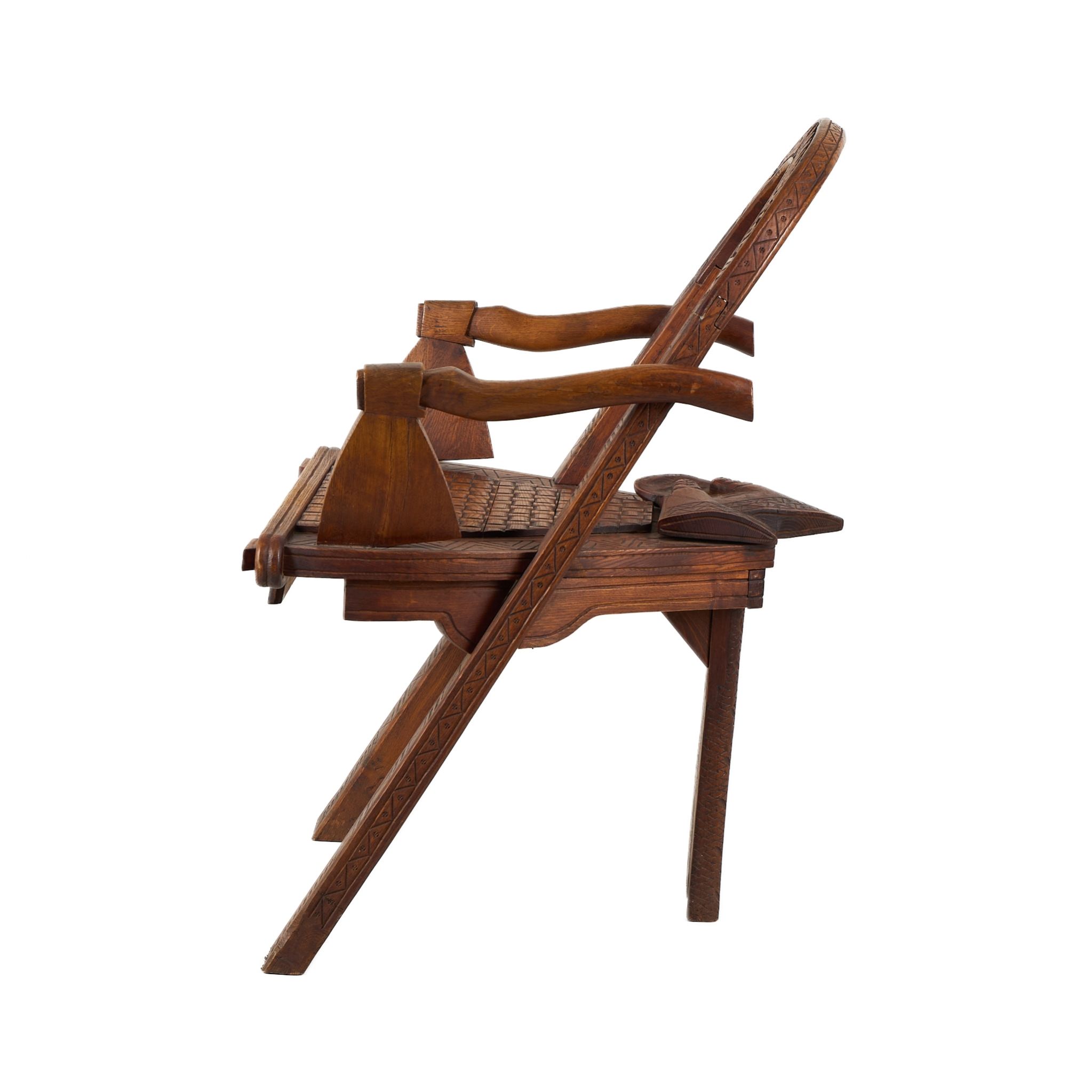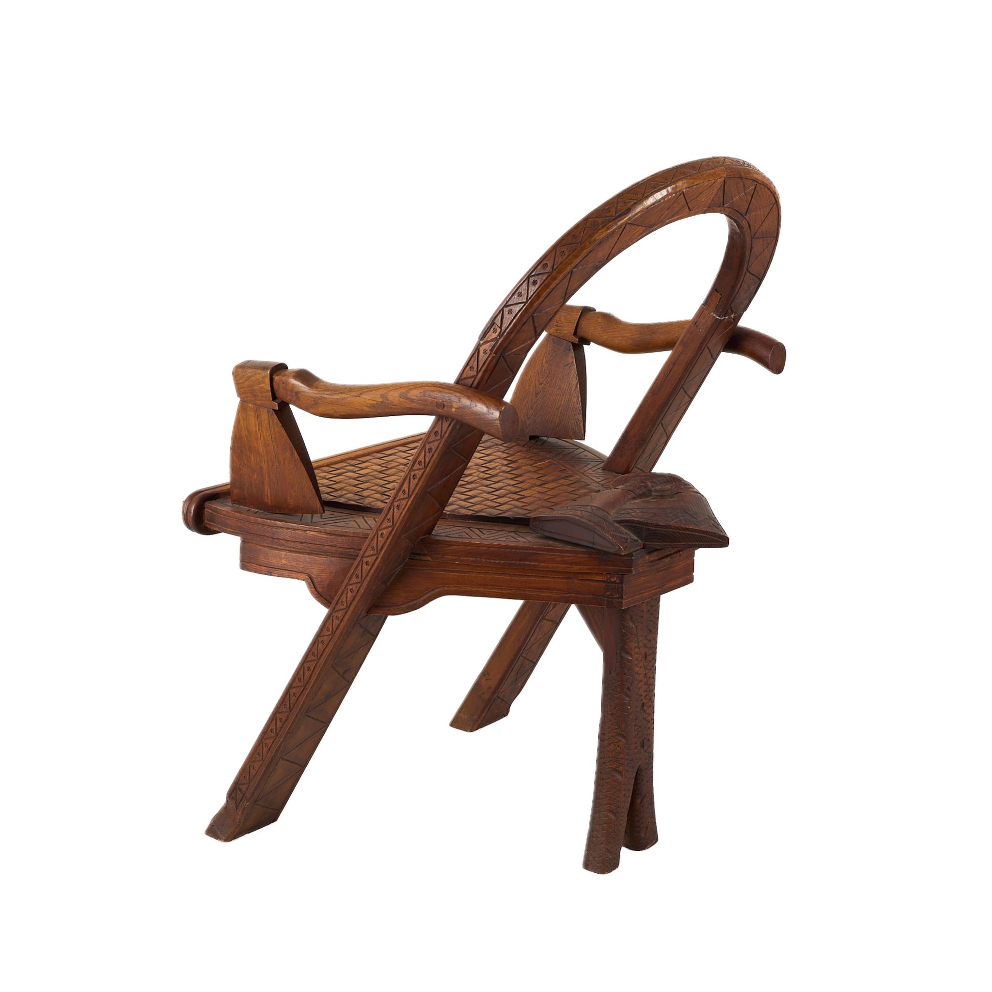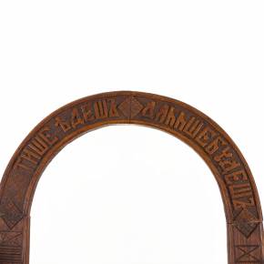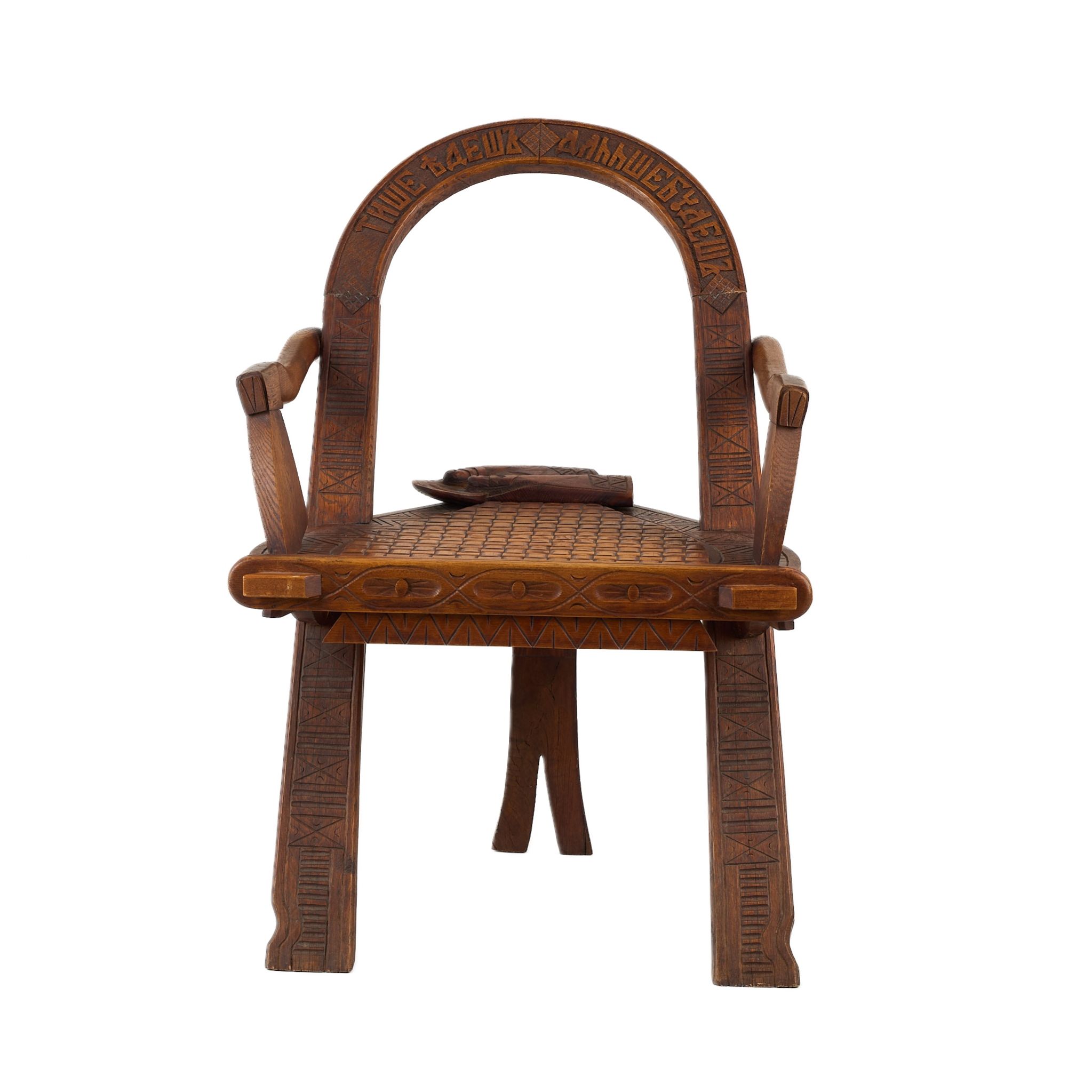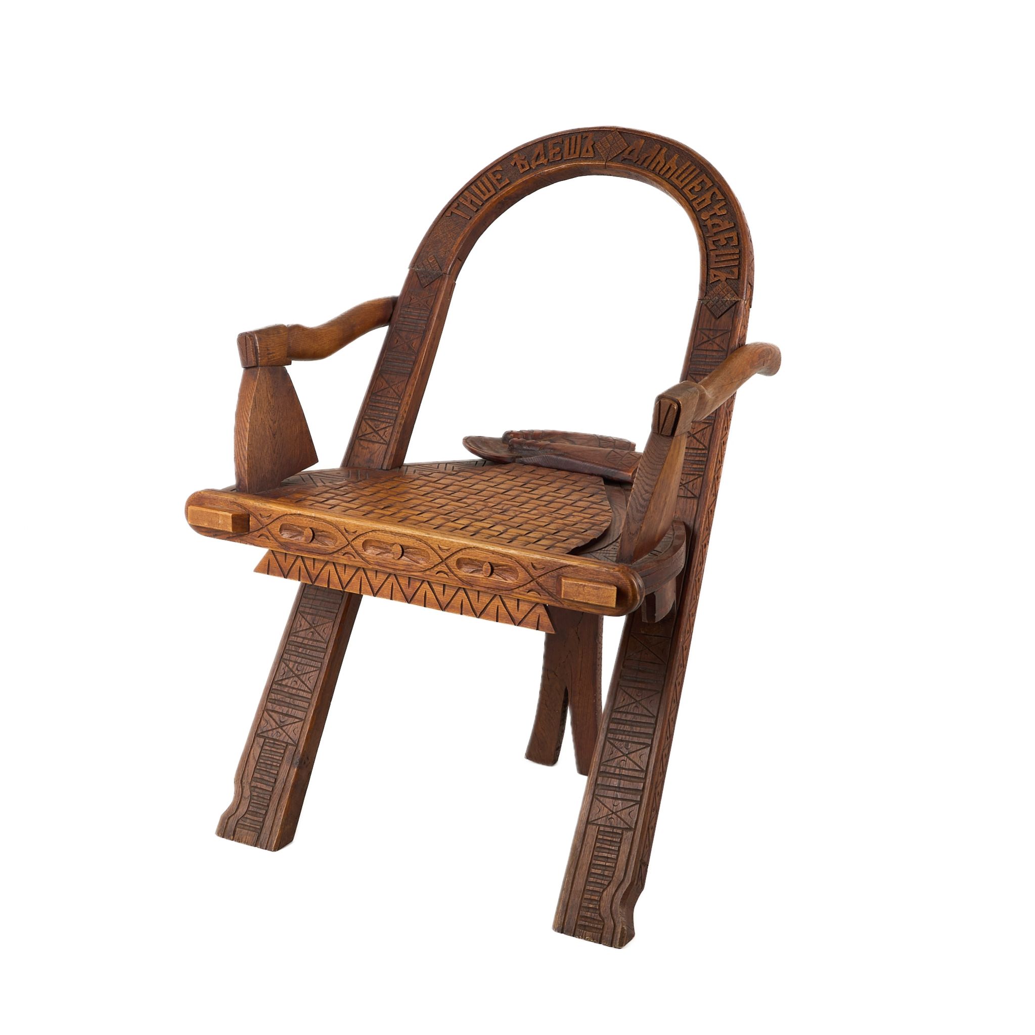 Редкое деревянное кресло, выполненное из дуба, украшено панславянскими народными мотивами и символическими элементами. Спинка представляет собой арку с резной надписью народной пословицы: «Тише едешь — дальше будешь». Подлокотники выполнены в форме стилизованных топоров, а на сиденье размещены резные зимние перчатки, словно оставленные хозяином. Декор дополнен орнаментами в виде ромбов, косых крестов и геометрических узоров, характерных для русской резьбы по дереву второй половины XIX века.