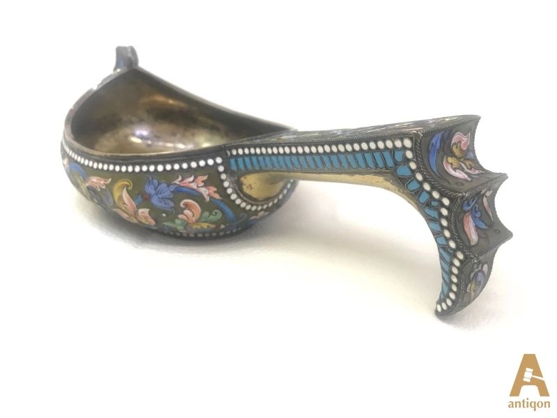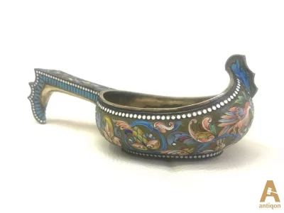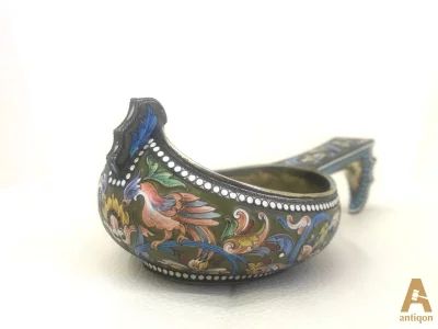 Русский серебряный ковш, украшенный декором в технике перегородчатая эмаль.