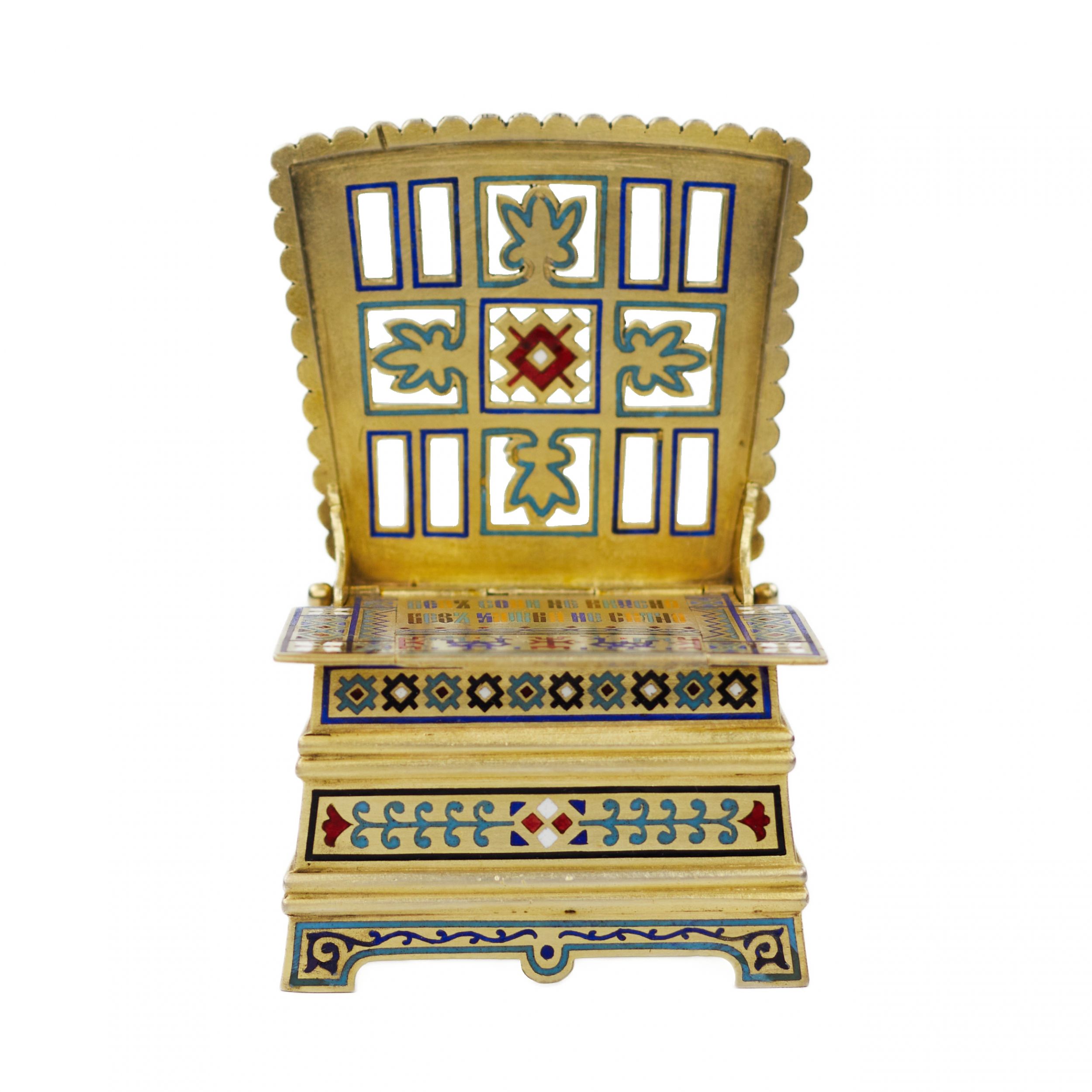 Редкая солонка в форме трона, исполненная из серебра с оригинальным золочением и покрытая многоцветной выемчатой эмалью, представляет собой выдающийся образец русского декоративно-прикладного искусства конца XIX века. Произведена на знаменитой фабрике Павла Акимовича Овчинникова — поставщика Императорского двора, одного из ключевых представителей «русского стиля» в ювелирном деле.