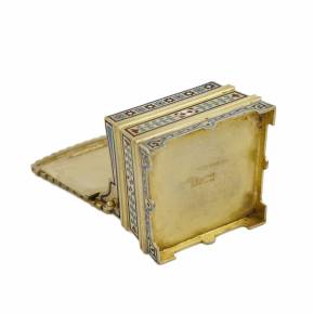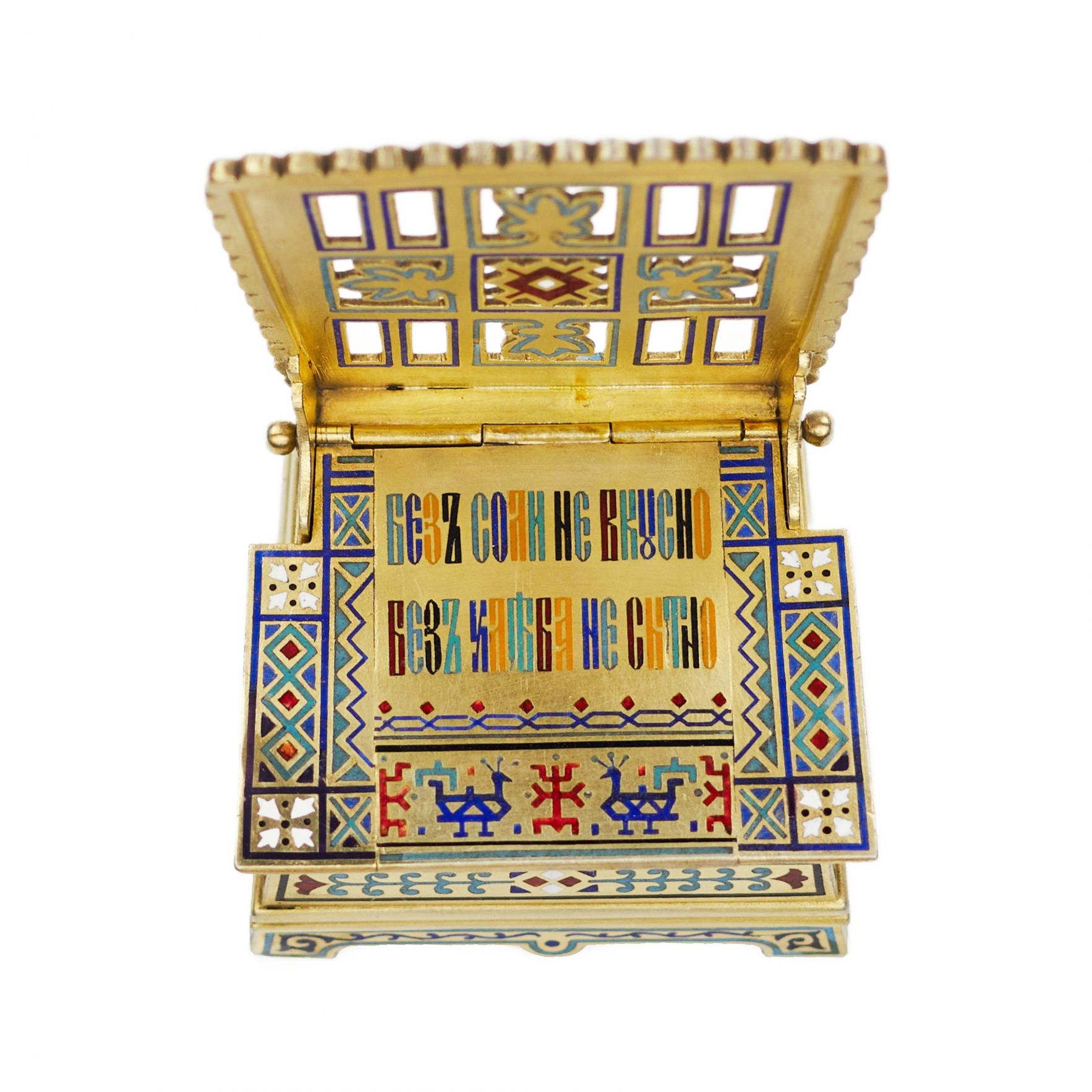 СЕРЕБРЯНАЯ СОЛОНКА-ТРОН С ПОСЛОВИЦЕЙ В ЭМАЛЯХ ФАБРИКА П.А. ОВЧИННИКОВА, МОСКВА, 1884 ГОД
