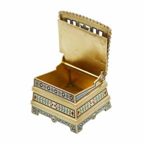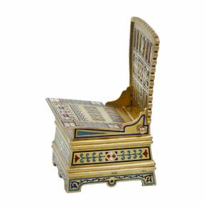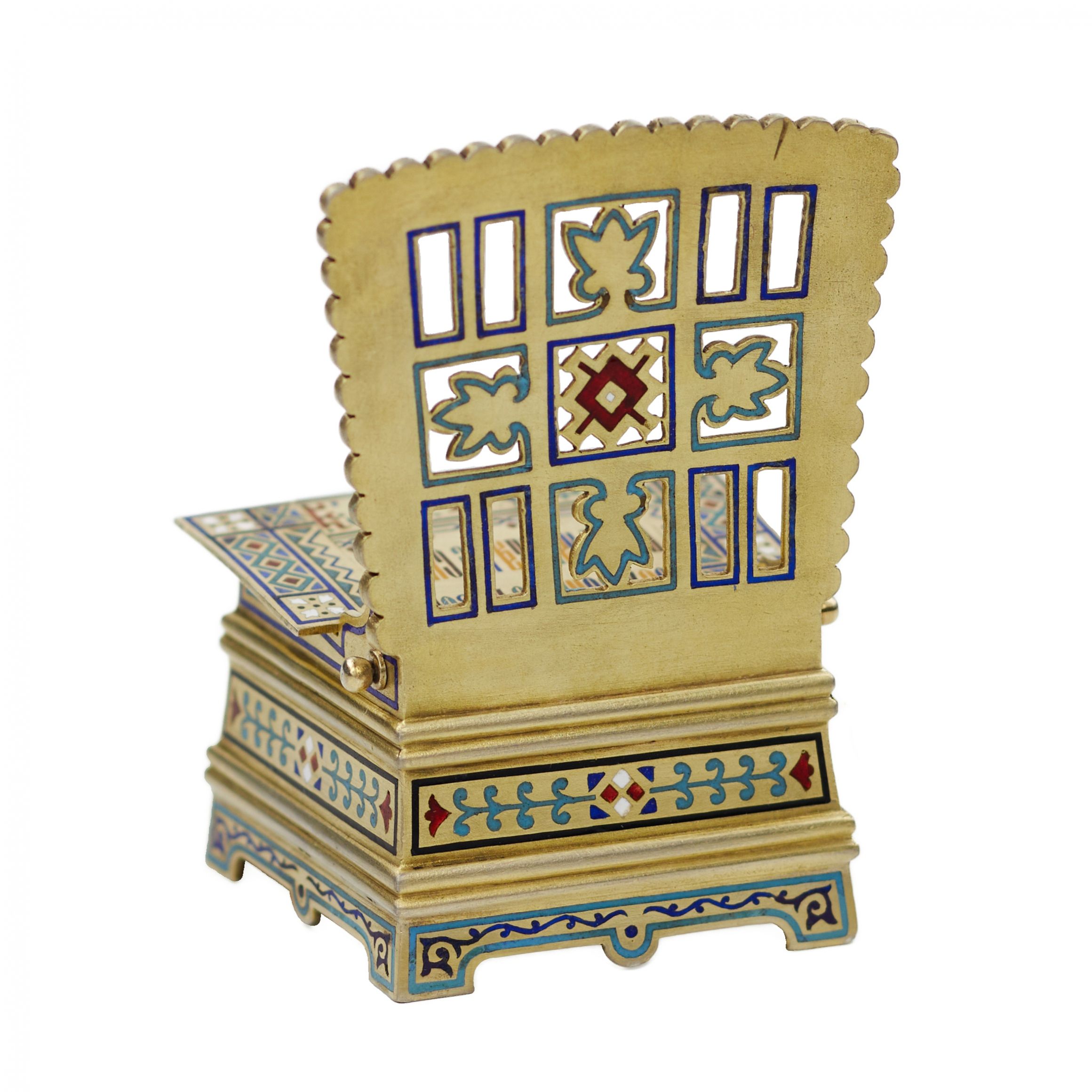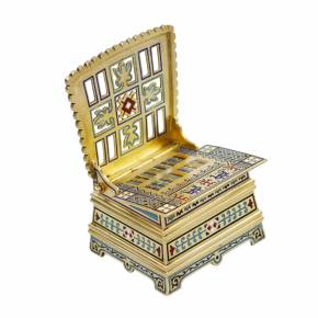 Форма миниатюрного кресла-трона, стилизованного под традиционную мебель, украшена орнаментами в духе народного искусства, с эмалевыми вставками насыщенной палитры. На внутренней стороне откидной крышки помещена пословица, выполненная в эмали по серебру: