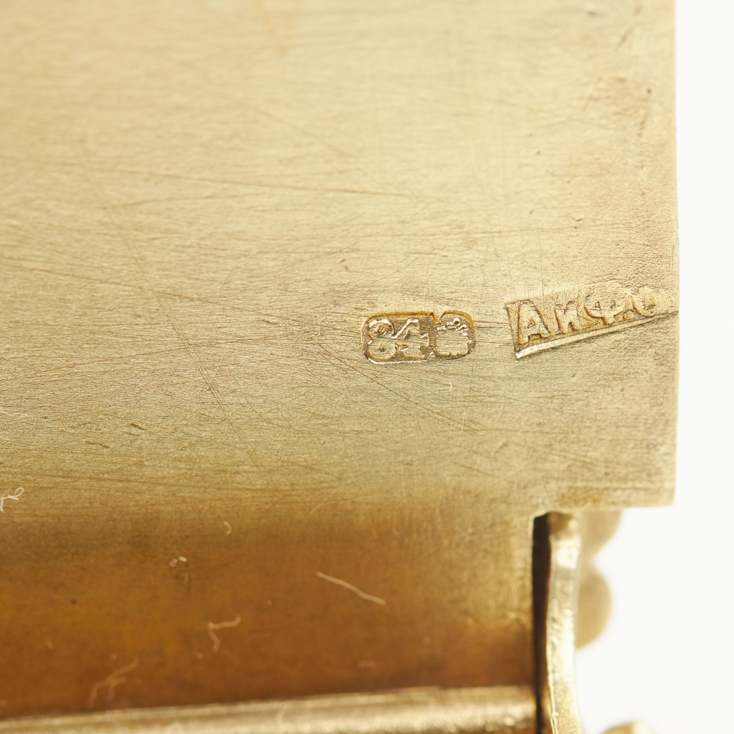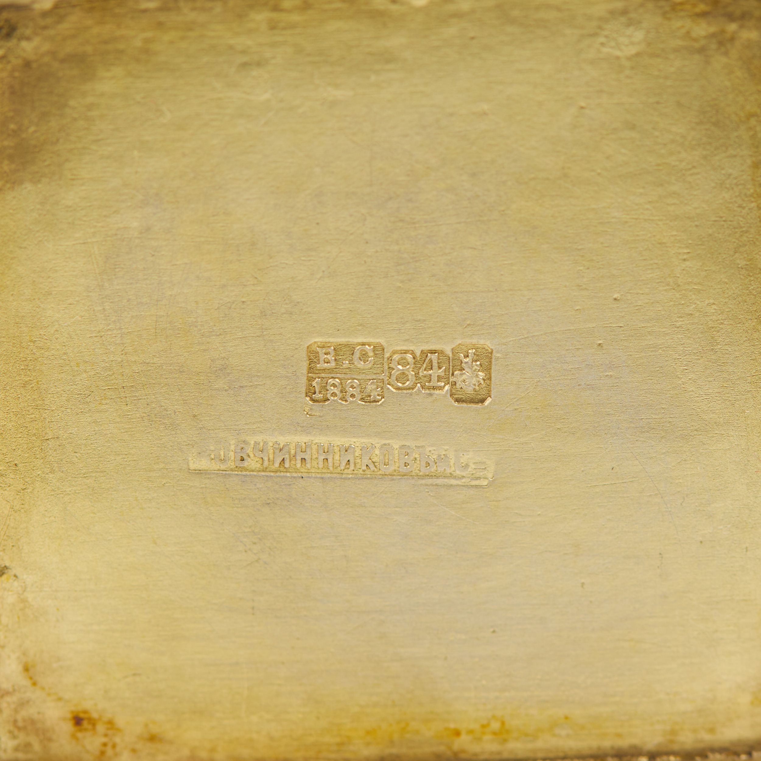 На откидной крышке: дополнительное пробирное клеймо с числом «84» и изображением Георгия Победоносца, а также клеймо «АиФ.О» — сокращение от «Артель и Фабрика Овчинникова», использовавшееся на изделиях, изготовленных в рамках артельного подразделения при фабрике.
