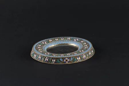Серебряное блюдце, украшенное цветочным орнаментом выполненным в технике Перегородчатая эмаль.