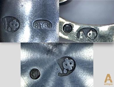 Клейма: Именник мастера "А.Ф" - Фульд Александр Иосифович. Произведения мастера представлены в коллекции ГИМ.(ММ Постникова-Лосева), Московского окружного пробирного управления 1899-1908 годов, на котором изображены: цифра «84», удостоверяющая пробу серебра;«женская голова в кокошнике», повернутая влево - знак государственного удостоверения; "ИЛ" - инициалы управляющего округом Ивана Лебедкина, назначен с 1899 года.