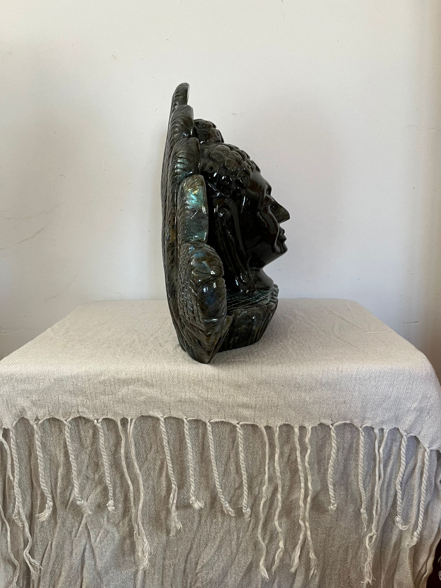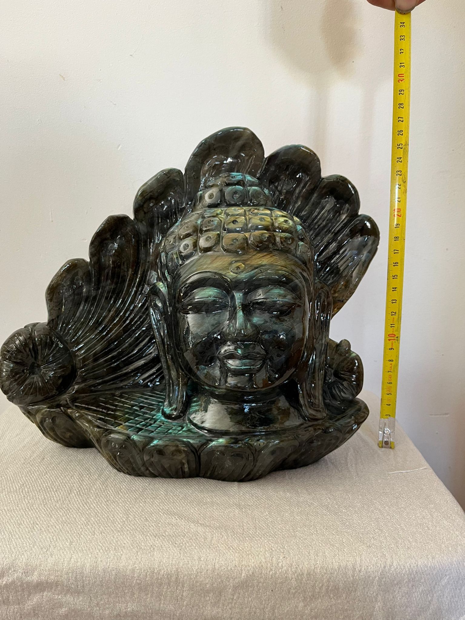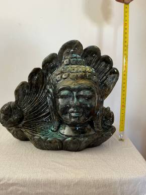 Прекрасная и редкая скульптура головы Будды, вырезанная из цельного куска лабрадорита (из Мадагаскара). Свойства и преимущества лабрадорита: - балансирует пищеварительную систему - защищает от негативной энергии - стимулирует иммунную систему - стимулирует вдохновение - регулирует гормональные нарушения - уменьшает чувство стресса и тревоги - придает энергии. Эта великолепная статуя весит более 9 килограммов и имеет высоту 26 сантиметров.