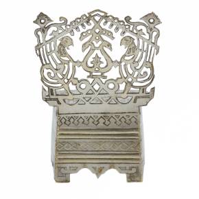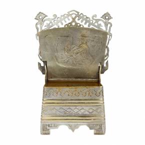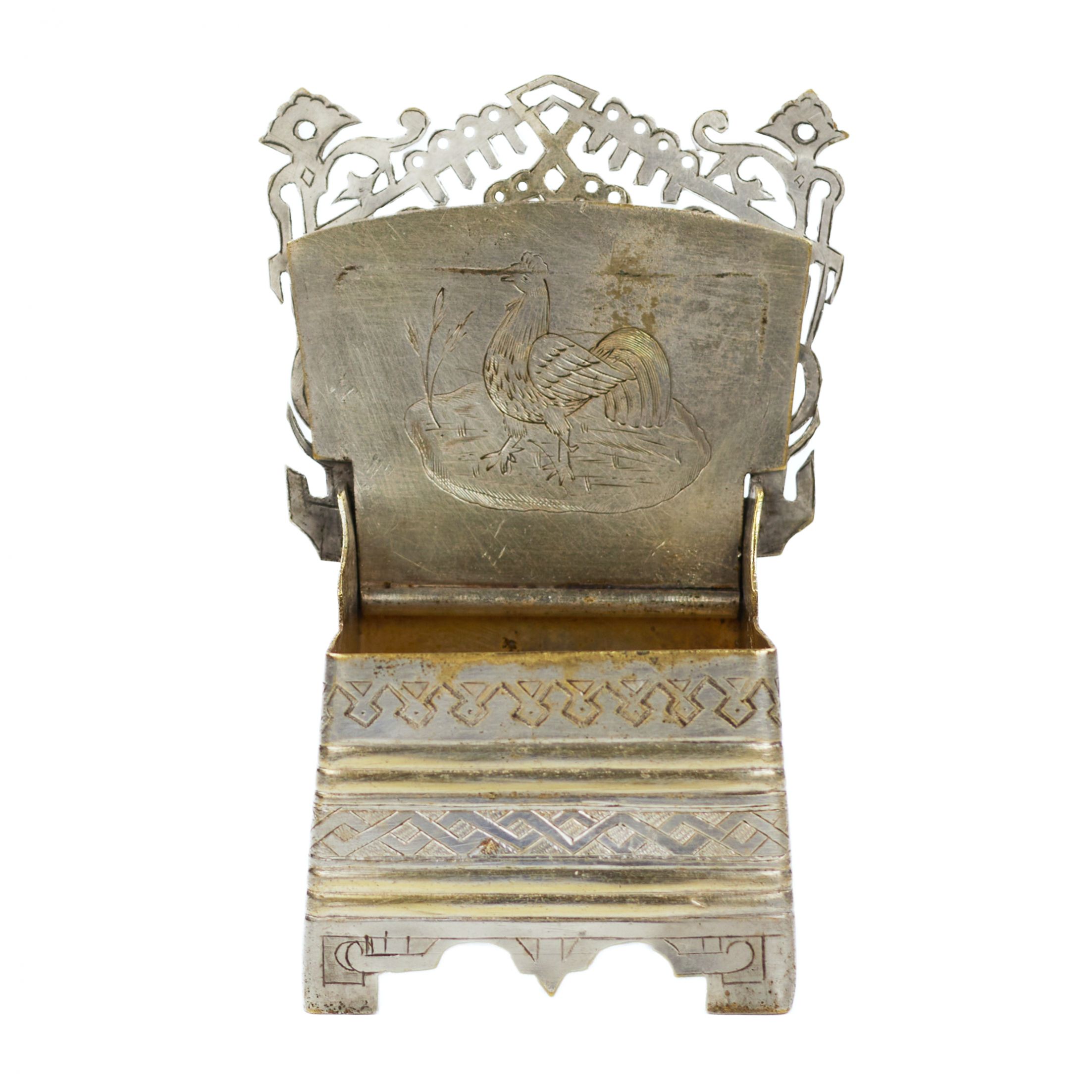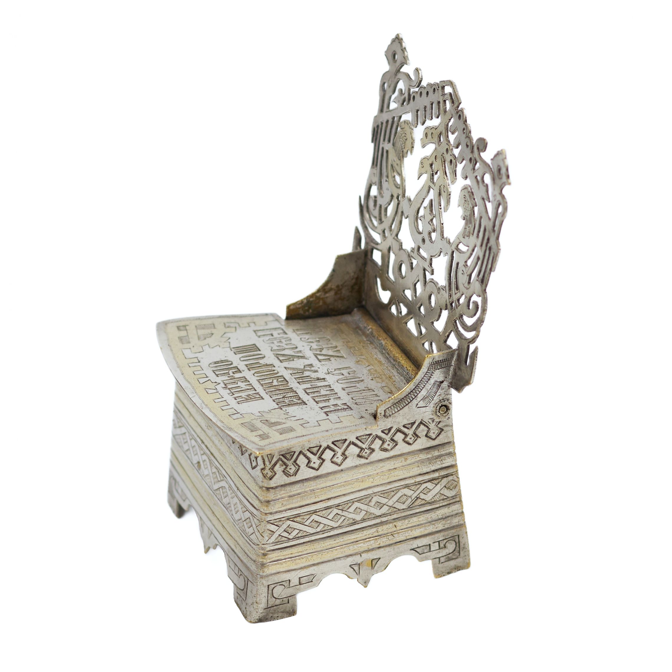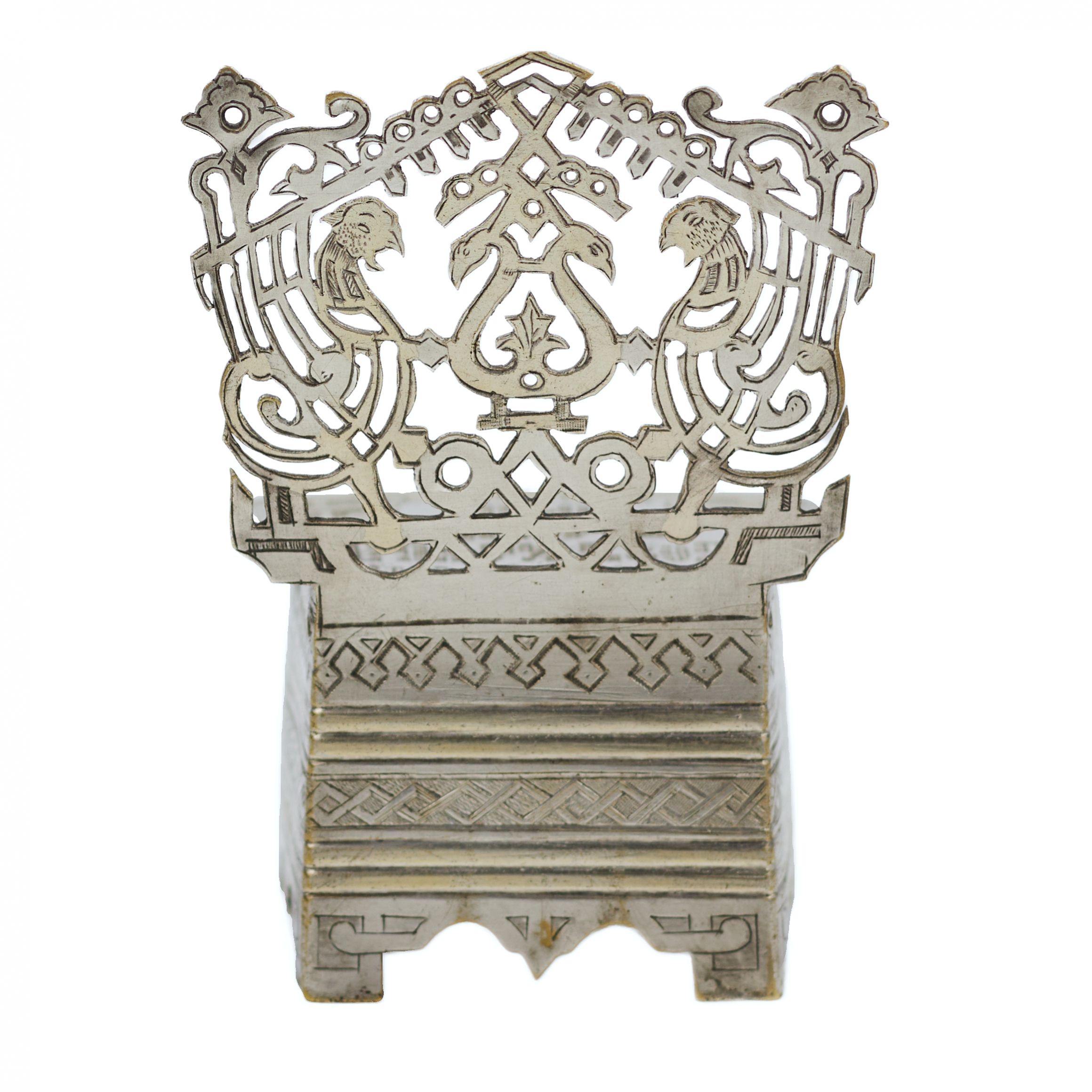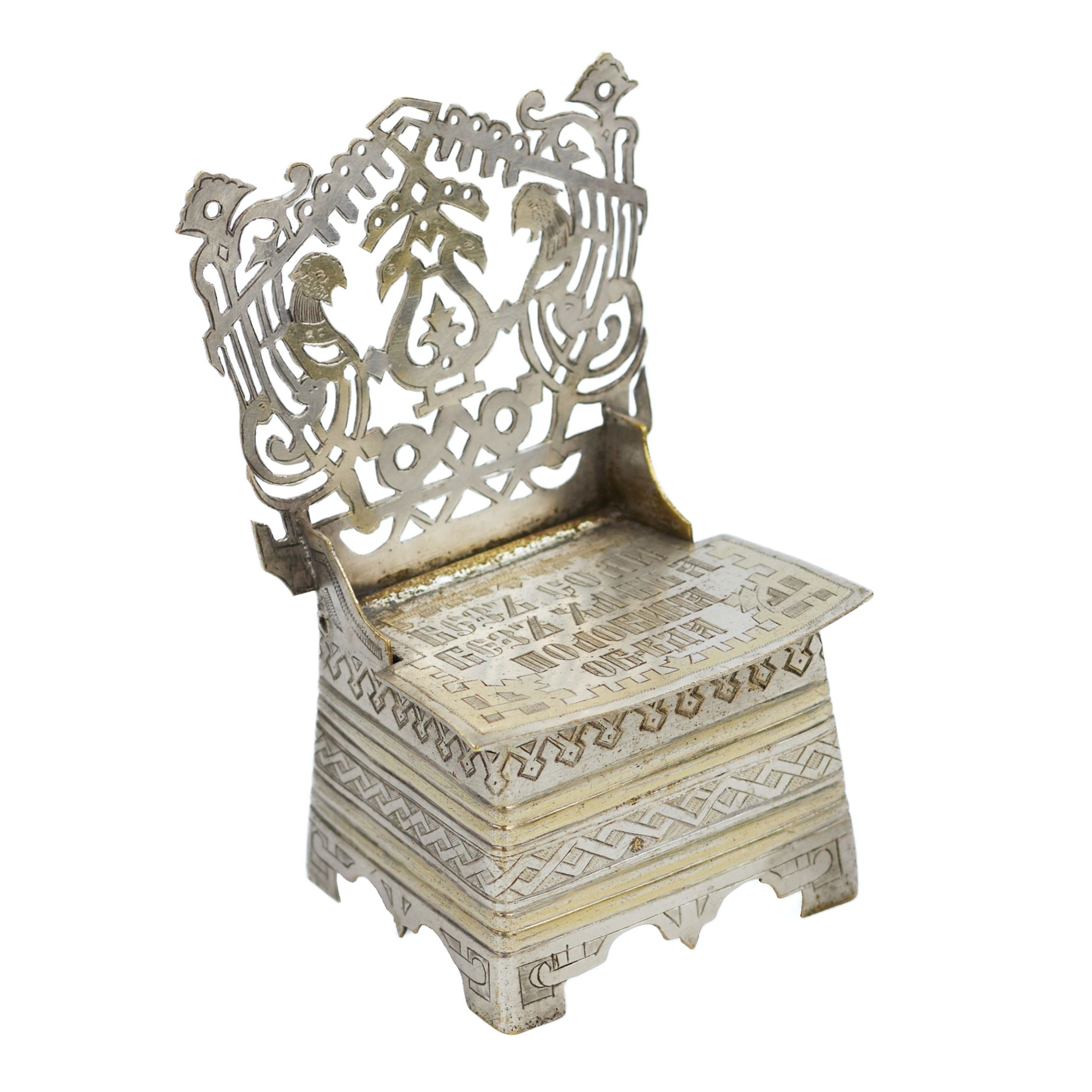 Изящная солонка в форме трона, выполненная из металла с серебрением. Спинка решётчатая, ажурная, украшена стилизованным орнаментом с птицами и растительным мотивом. На сиденье выгравирована надпись в старославянском стиле: «Без соли, без хлеба половина обеда». Внутренняя часть солонки открывается, на крышке выгравировано изображение петуха на фоне растительности. Боковые стенки и основание украшены геометрическим орнаментом с переплетением линий и характерным «русским» мотивом.